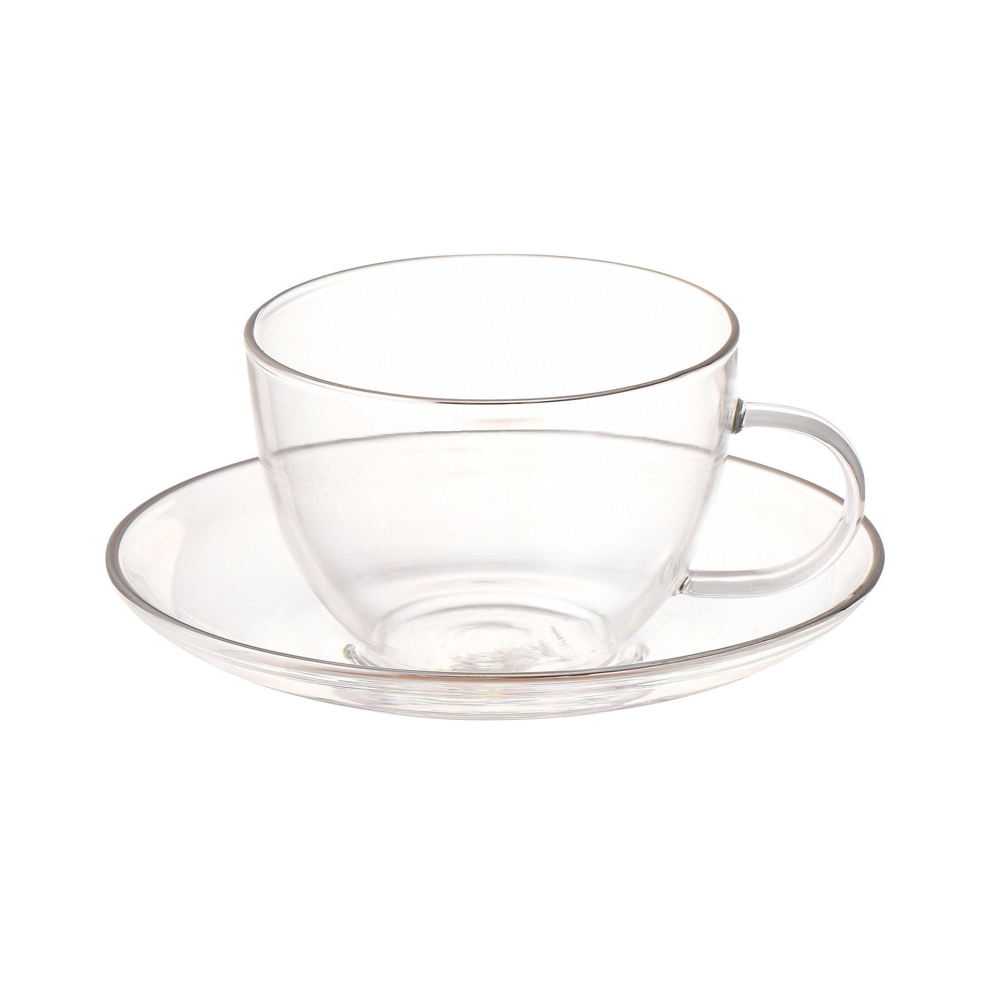 Heat resistant clear glass cup and saucer.The gorgeous design with a simple form and plating that makes it look great is recommended for home cafe time.