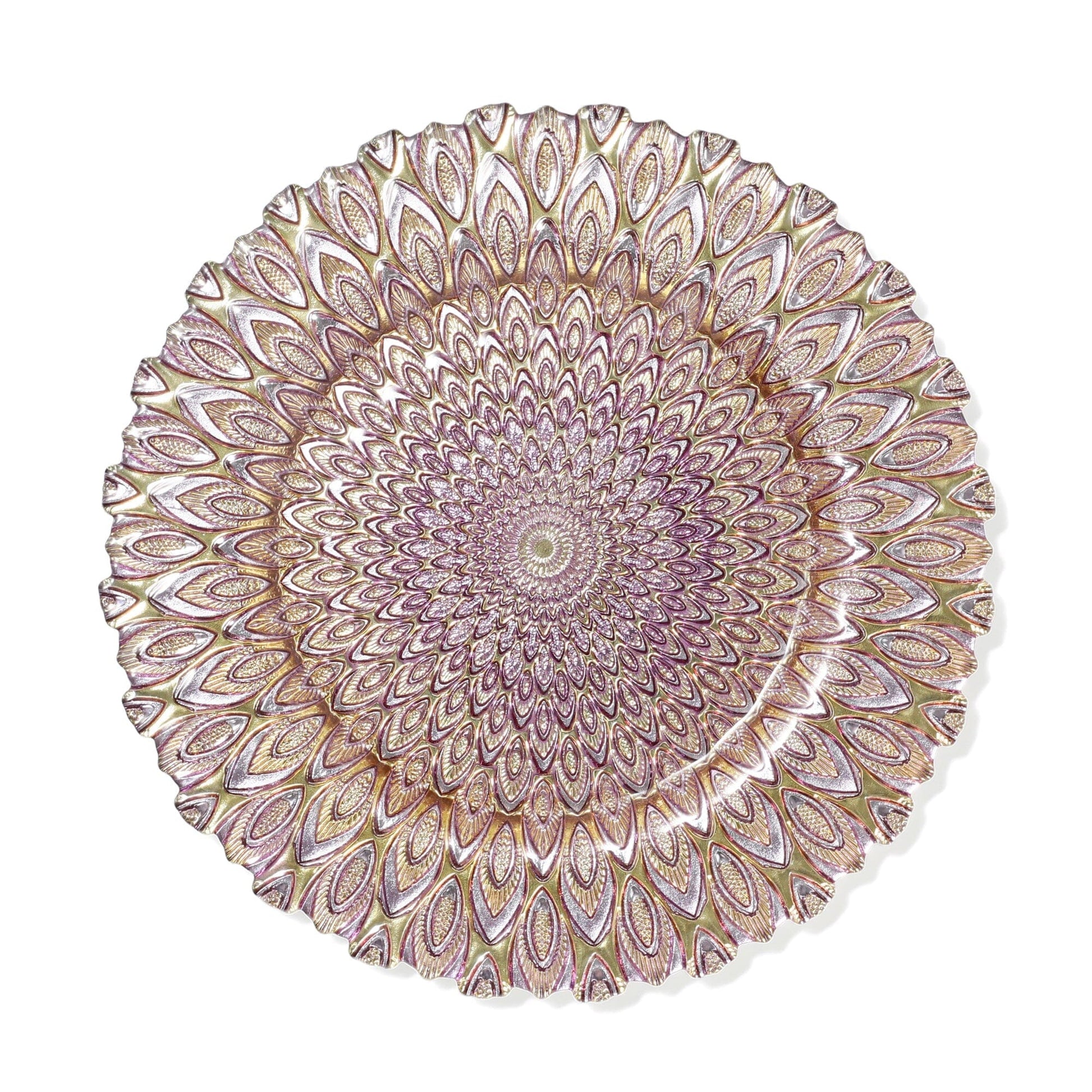 A large glass plate with a bold gold pattern.The gorgeous design has a presence that will be the main part of the dining table.
