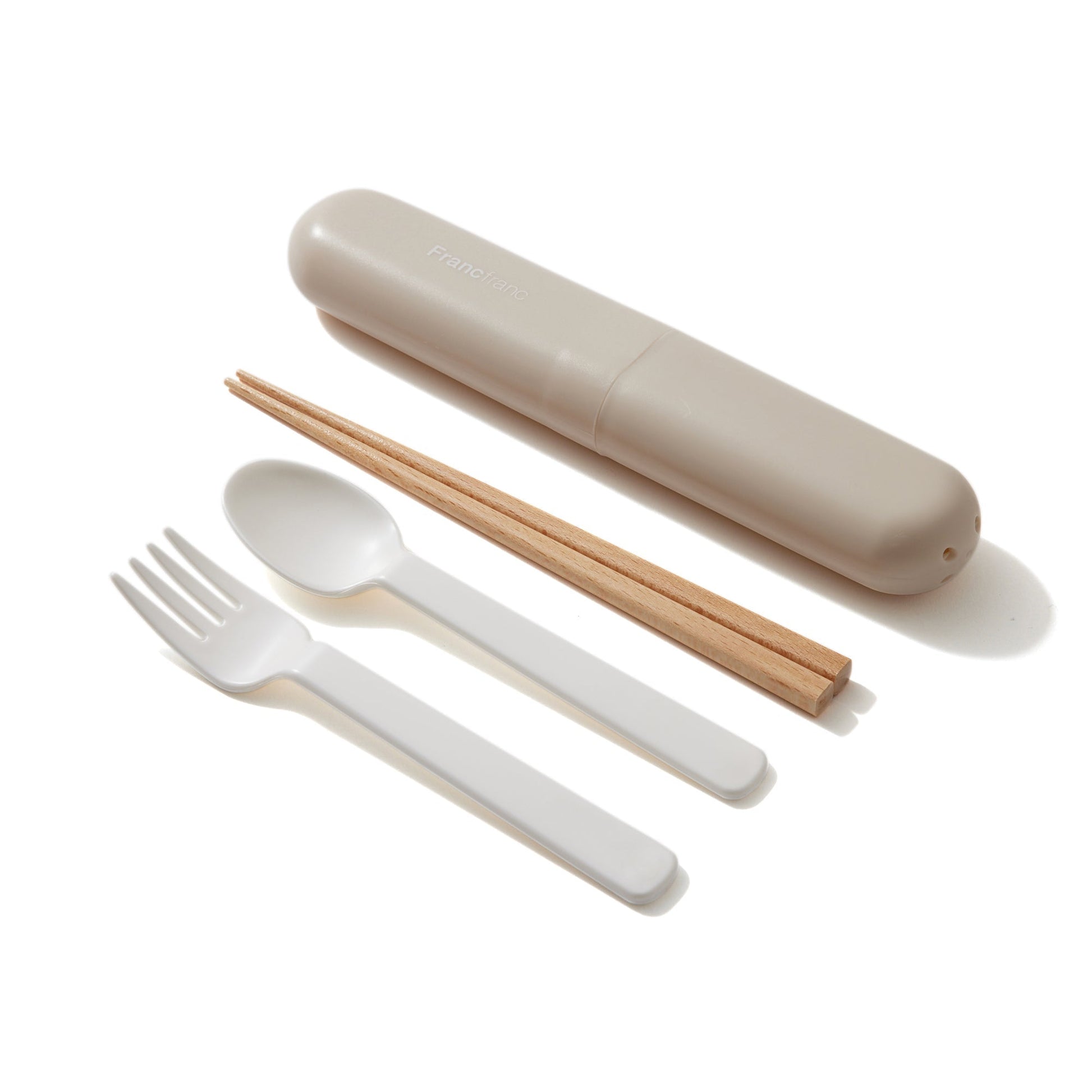 light and easy-to-carry cutlery set that includes chopsticks, a spoon, and a fork.We also consider environmental issues by adding plant-derived biomass plastic to a part of the raw material resin.