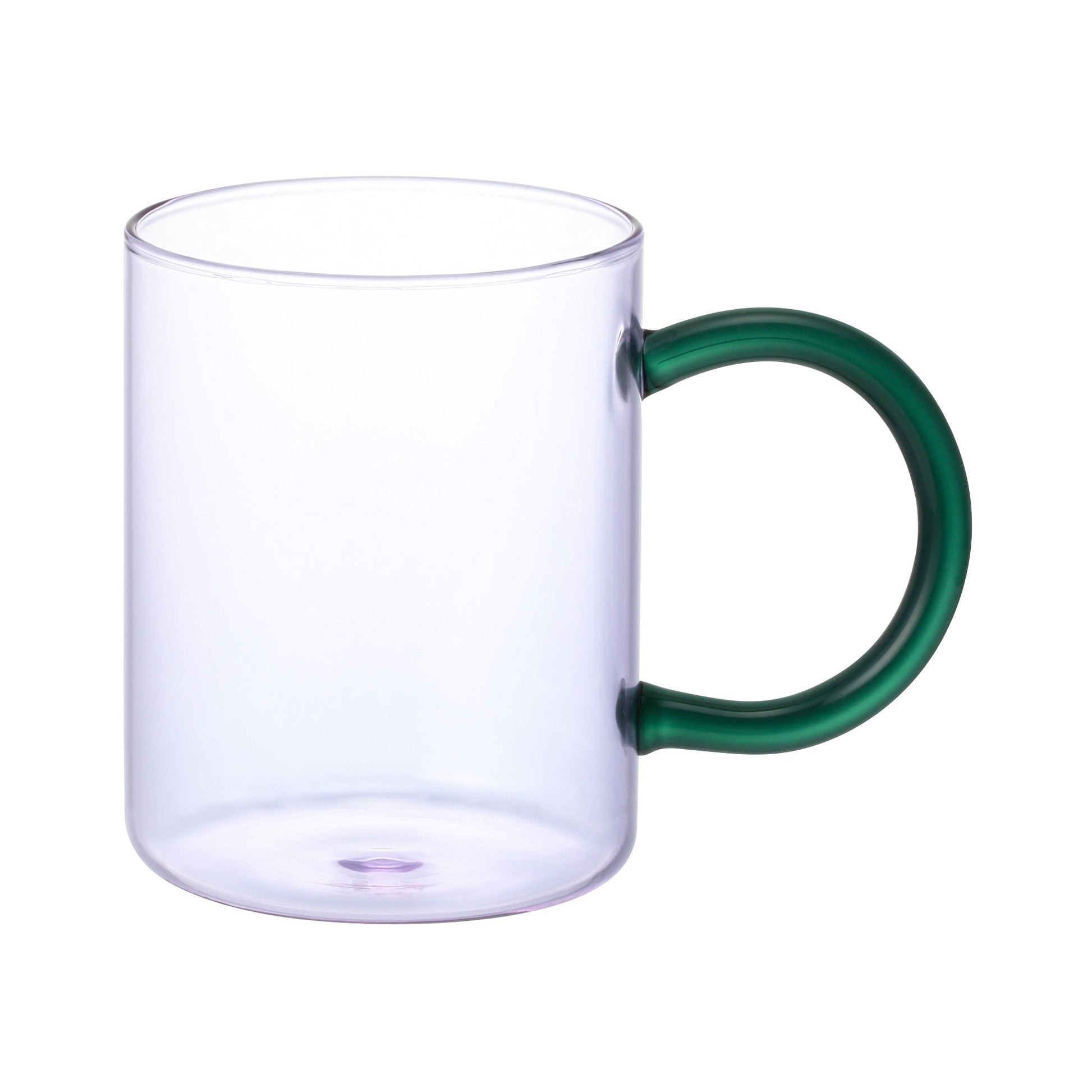 A color mug made of heat-resistant glass.The color combination of the handle of the handle and the color of the main cup has a unique finish.