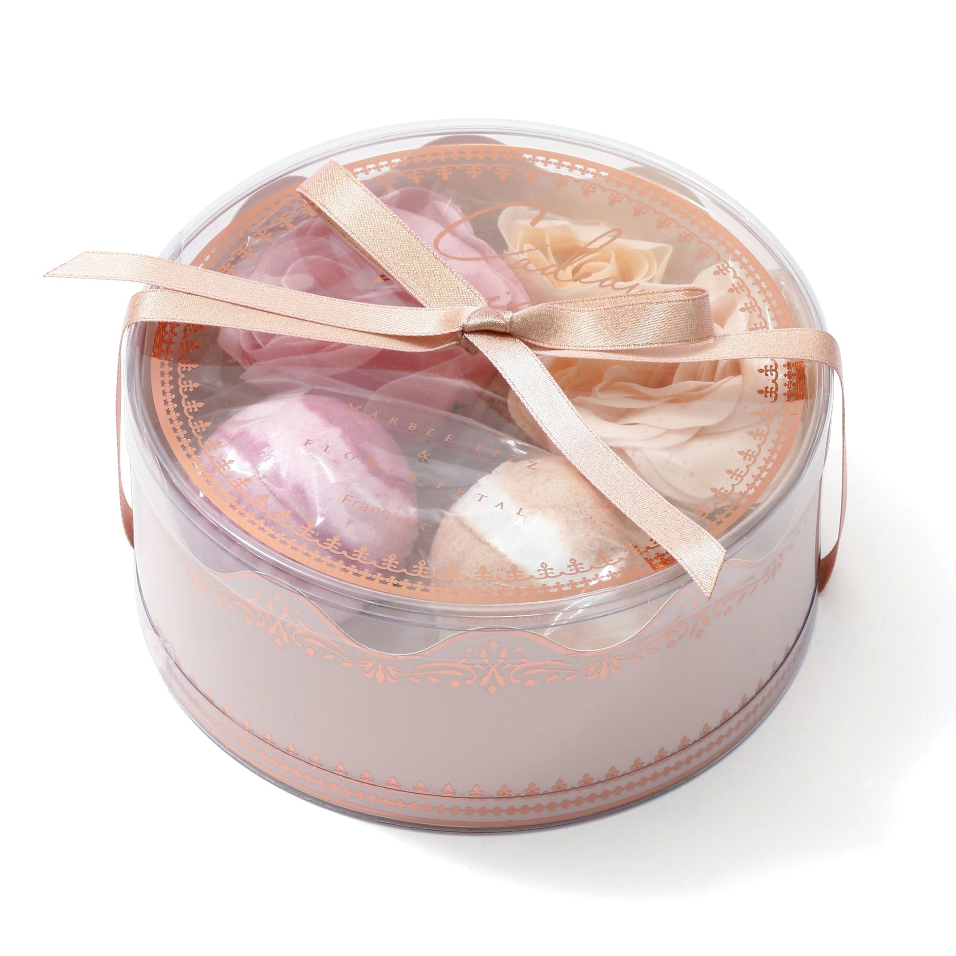 luxurious set of round marble-patterned bath fizz and a gorgeous flower-motif bath petal.The petals with realistic and delicate details are beautiful to look at, and you can enjoy them not only when you take a bath but also when you decorate them at the entrance.