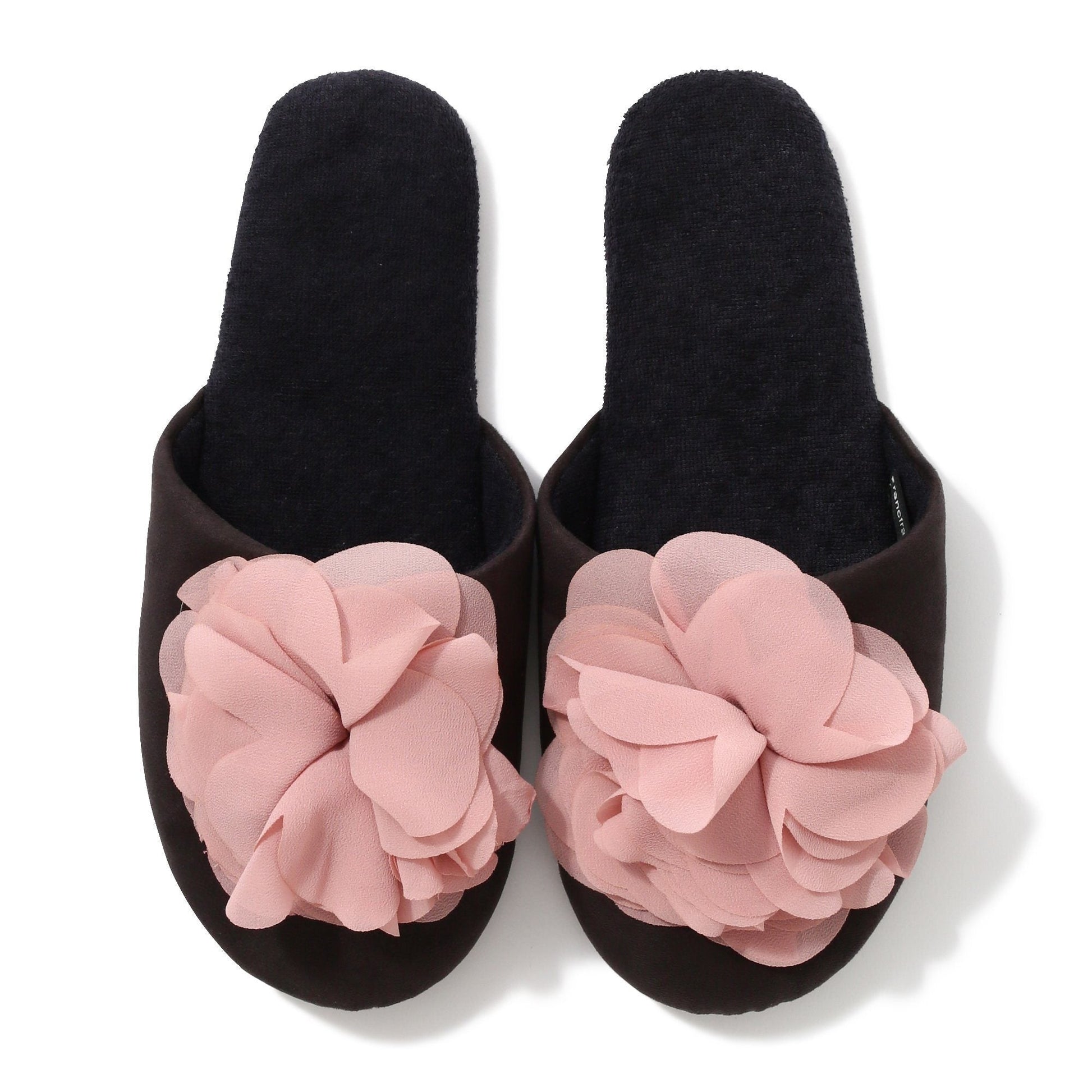 A cute room shoe that flutters as you walk.A cute design with soft chiffon flowers blooming in calm colors.