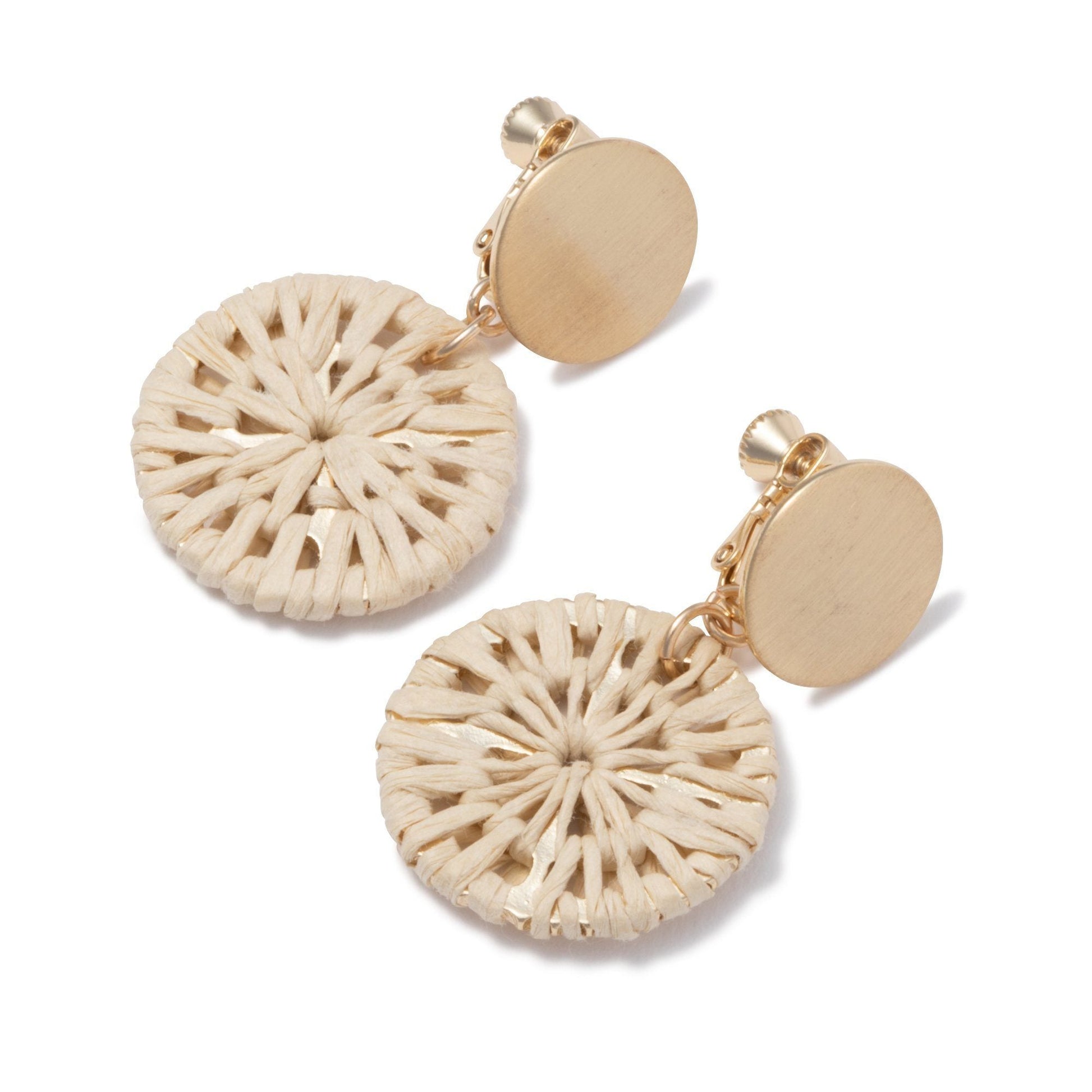 Earrings combining round metal and rattan-like parts.It is a design with a resort feeling that you want to wear in the warm season, but
