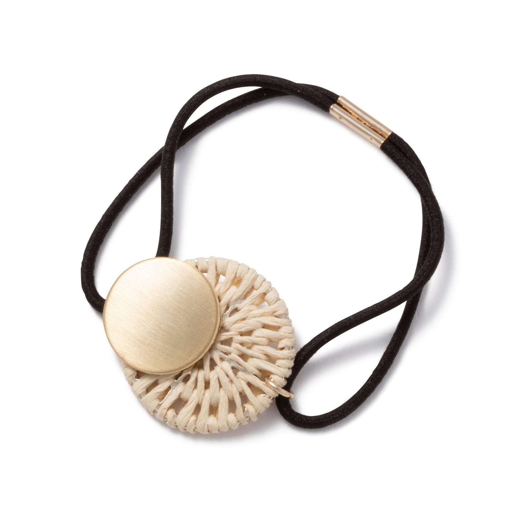 Hair elastic that combines round metal and rattan-like parts.The resort design is easy to use in everyday use because the colors are simple as well as the warm season.