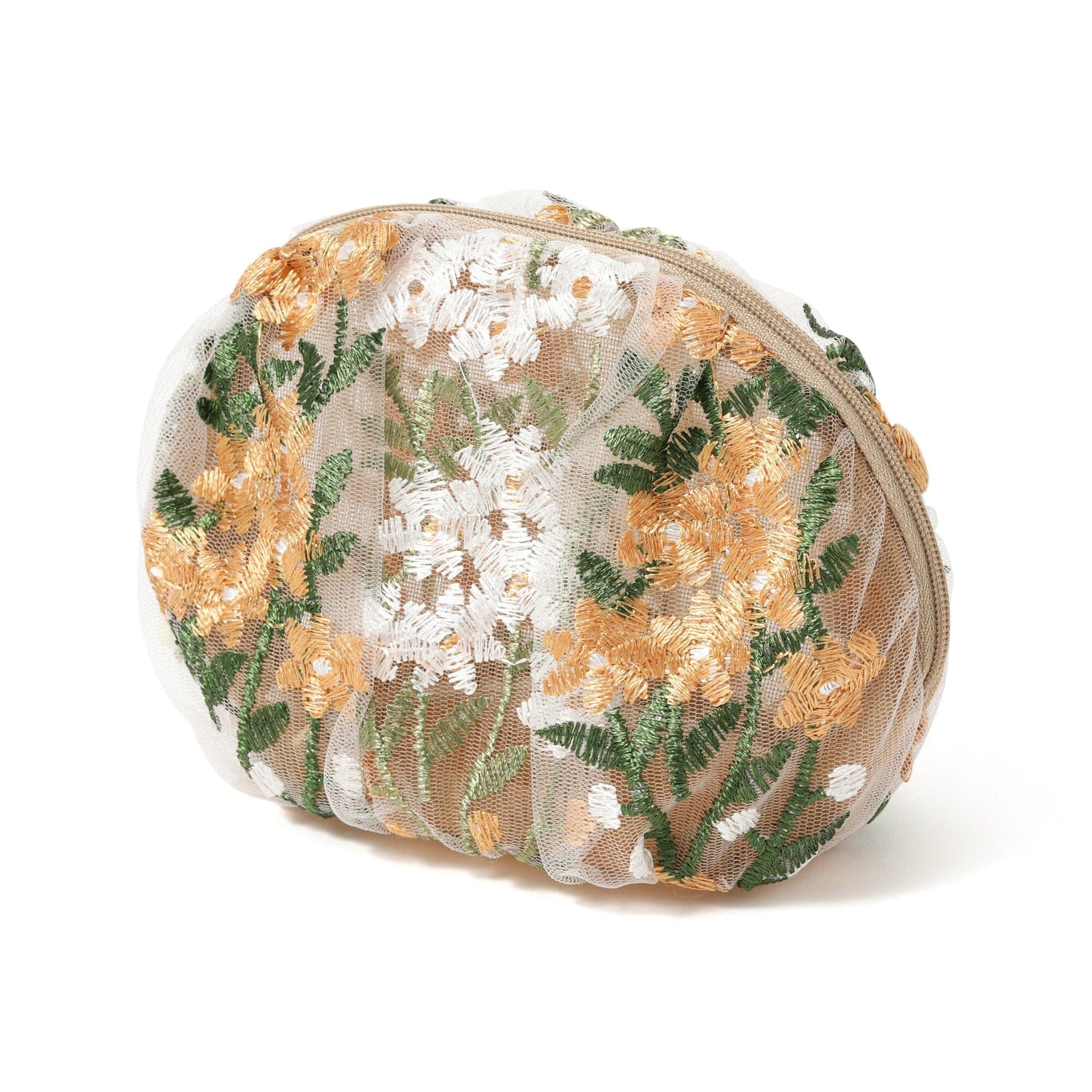 A cute round pouch with sheer tulle material and embroidered flower motifs.A gentle form that makes full use of the fluffy feeling of tulle. The inner fabric is made of hard tulle to maintain a clean form and make it easy to put in and take out makeup tools.