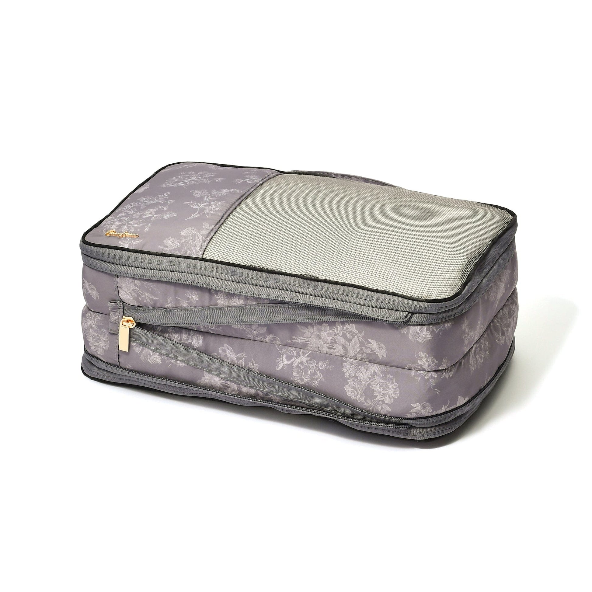 An organizer that stores bulky clothing and easily compresses it by simply closing the zipper.Closing the zipper on the outside one and a half times will compress the clothing.