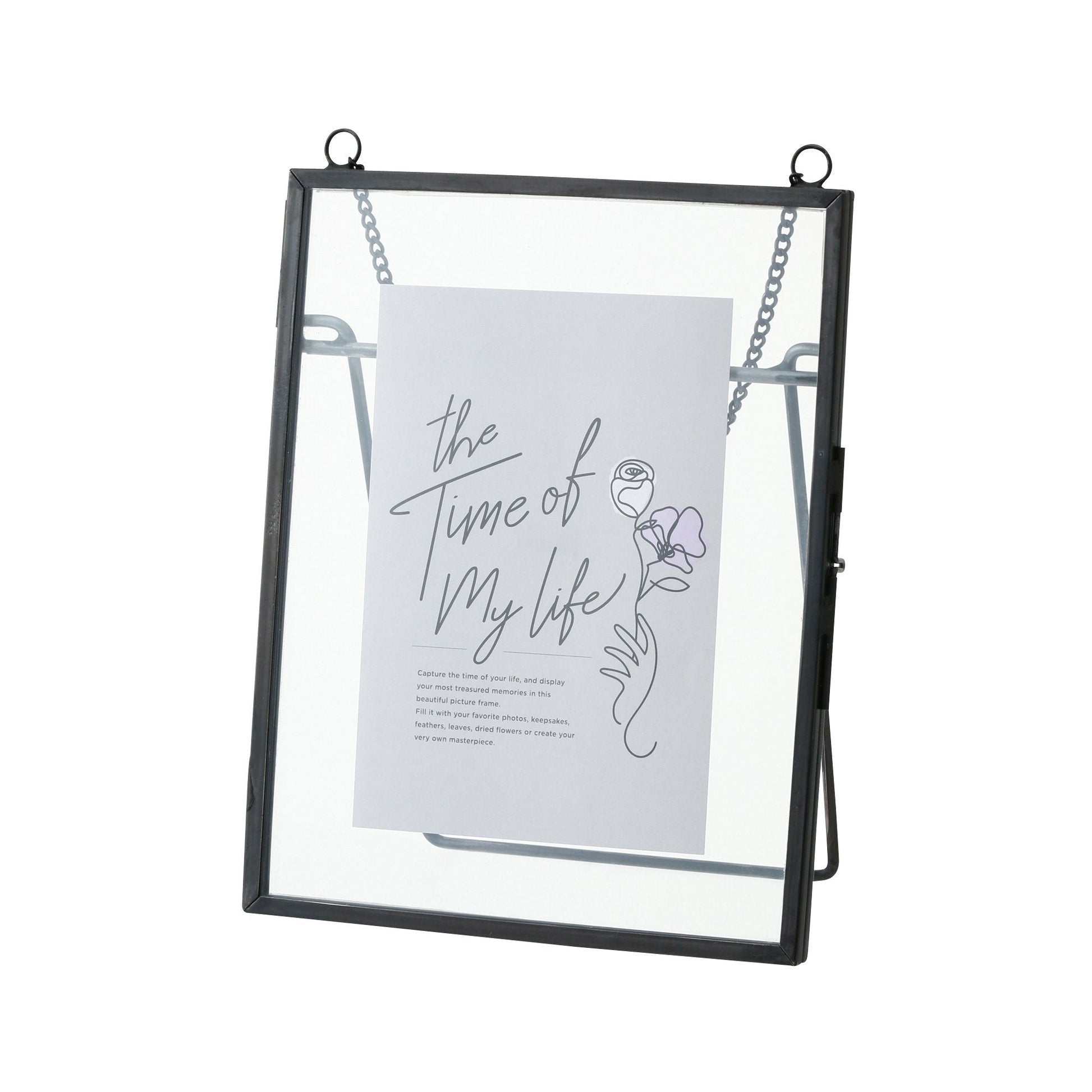 It is a glass frame with a simple design.It is a design that you can enjoy in 2 ways by leaving it as it is or hanging it with a chain.