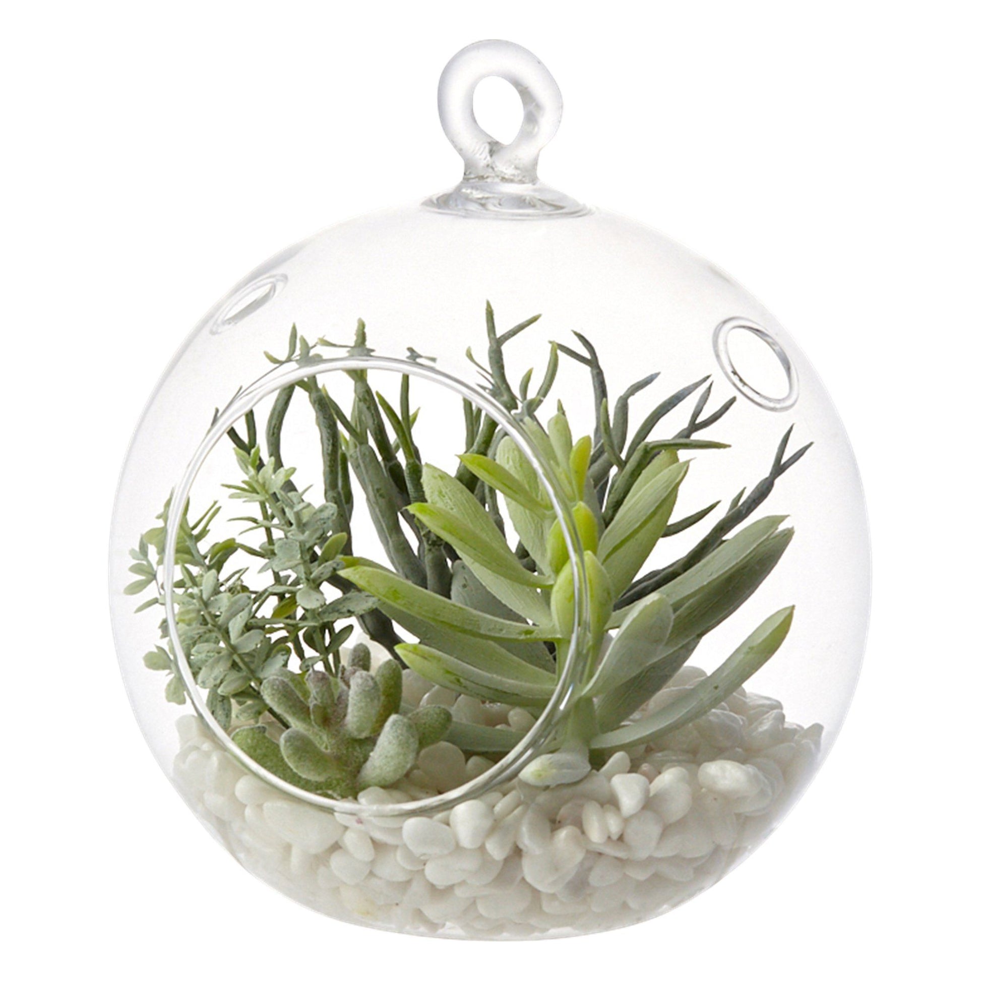 An adorable interior decoration of succulent plants and refreshing white stones in a glass pot. Perfect match for almost everywhere. Hang it with a wire can style up your space.Specifications