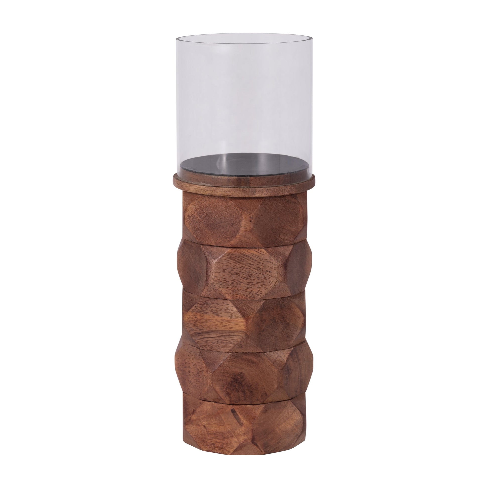 Wood, 12" Stacked Hexagon Pillar Hurricane, Brown