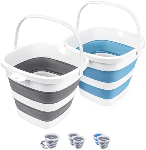 2 Pack Collapsible Buckets 10L 2.6 Gallon Cleaning Bucket Mop Bucket Folding Foldable Portable Small Plastic Water Supplies for Outdoor Garden Camping Fishing Car Wash Space Saving Square Grey Blue