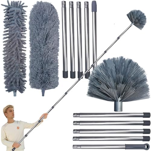 3 PCS Duster Kit: This microfiber hand duster set includes 170in/14 feet Extension Pole(Stainless steel poles can be installed according to requirements), 1 pcs Bendable Microfiber Duster Head(18in), 1 pcs Spider web Duster Head and 1 pcs Chenille Dusters Head. Replacing different types of duster brush heads can handle different cleaning scenarios, keeping your home away from dust.