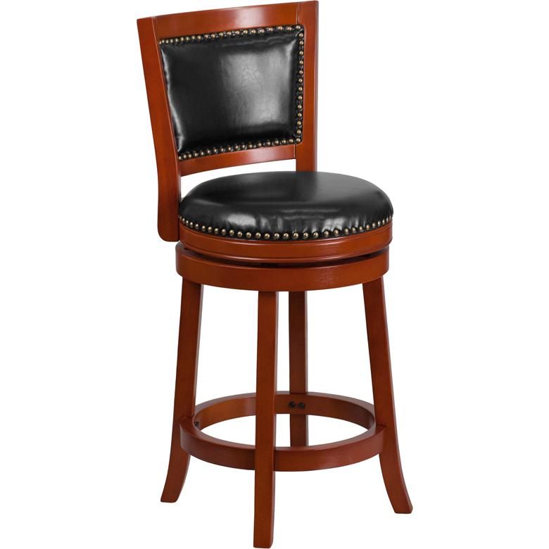 26'' High Light Cherry Wood Counter Height Stool with Open Panel Back and Black LeatherSoft Swivel Seat