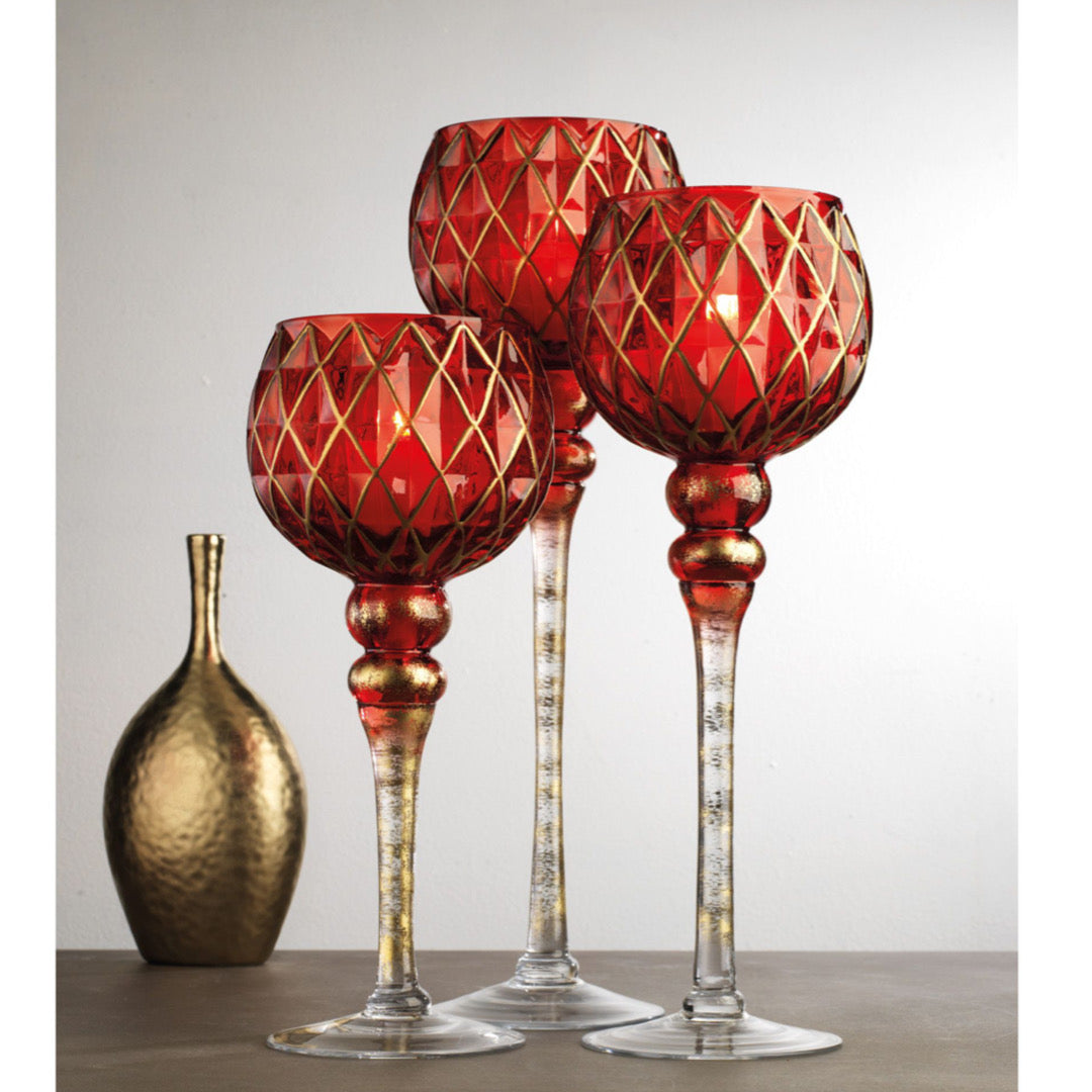 Style up your home with our 3pc CANDLE HOLDER DIAMOND RED/GOLD HURRICNE home decor accent. This CANDLE HOLDER decor piece breathes new life into an otherwise dull surface or shelf in your living space.