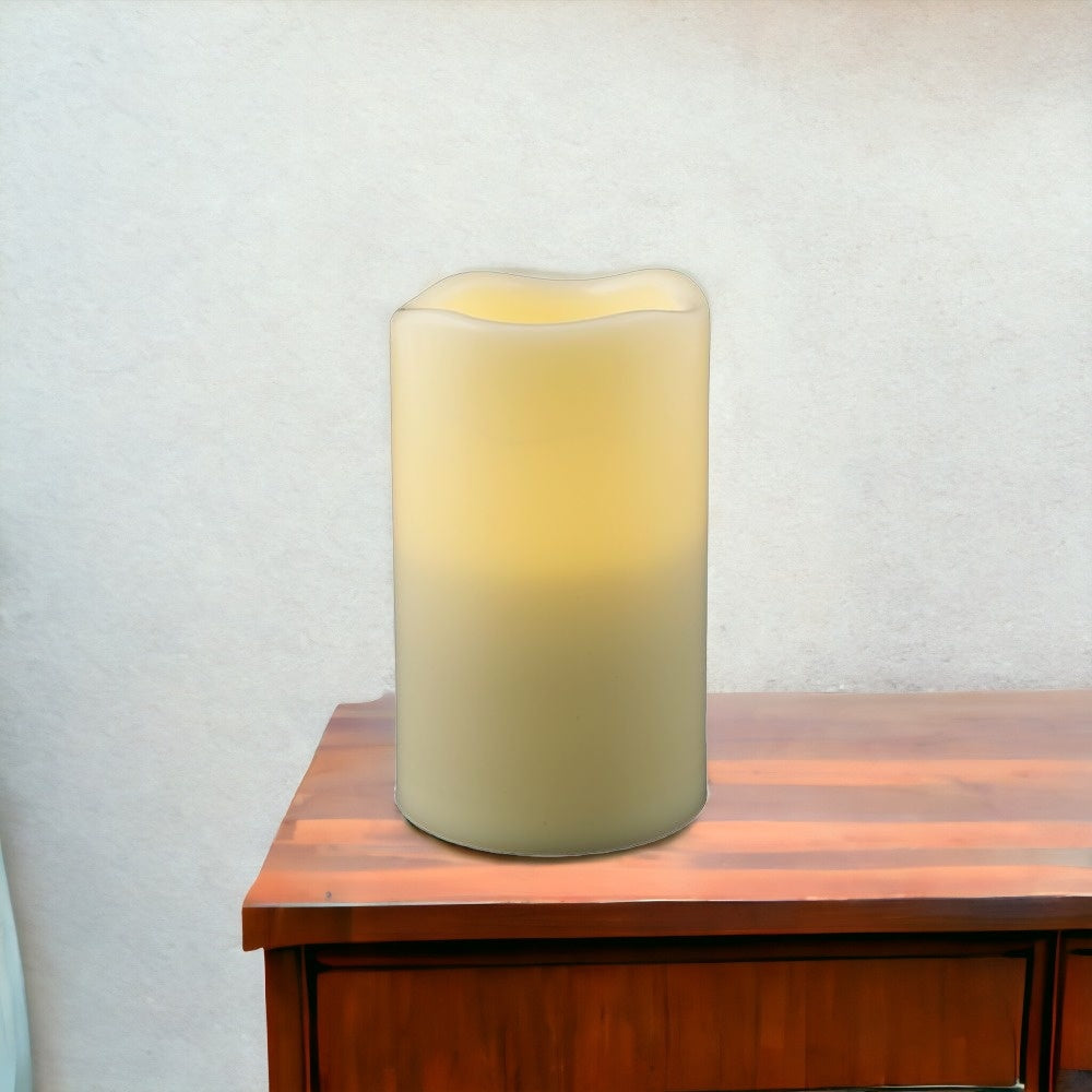 With our 5-inch ivory flameless indoor outdoor pillar candle, you can experience the warm and inviting glow of candlelight. The classic shape makes this pillar candle a versatile addition to any decor style, whether it's traditional, contemporary, or modern. The flickering feature is designed to create an authentic candlelight experience. Let the warm glow of candlelight create an intimate and welcoming ambiance for your guests or a soothing atmosphere for yourself. 4.75-inch H x 3-inch W x 3-inch D