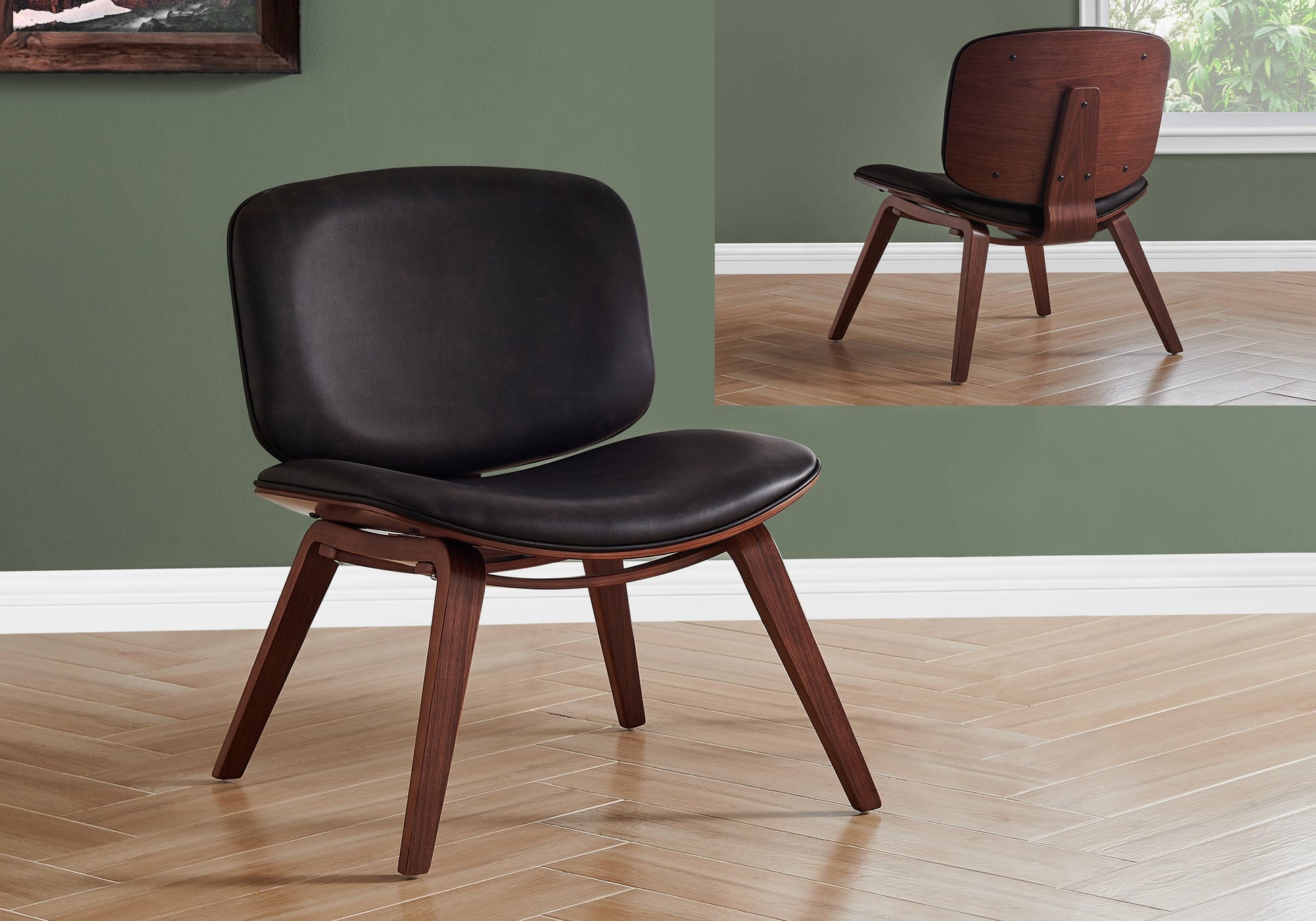 Add some flair to your space with this updated version of a mid-century inspired modern accent chair! The rich walnut brown solid wood legs and back beautifully support this armless chair that features a thick foam cushioned scoop seat, upholstered in a handsome dark brown leather look material. Start with your entry way or bedroom when you need a seat to put on or take off your shoes; bring it into a quiet corner of your living room as extra seating with style. Such a versatile chair that you can move it from room to room and it will look good no matter where you place it! Assembly is required.