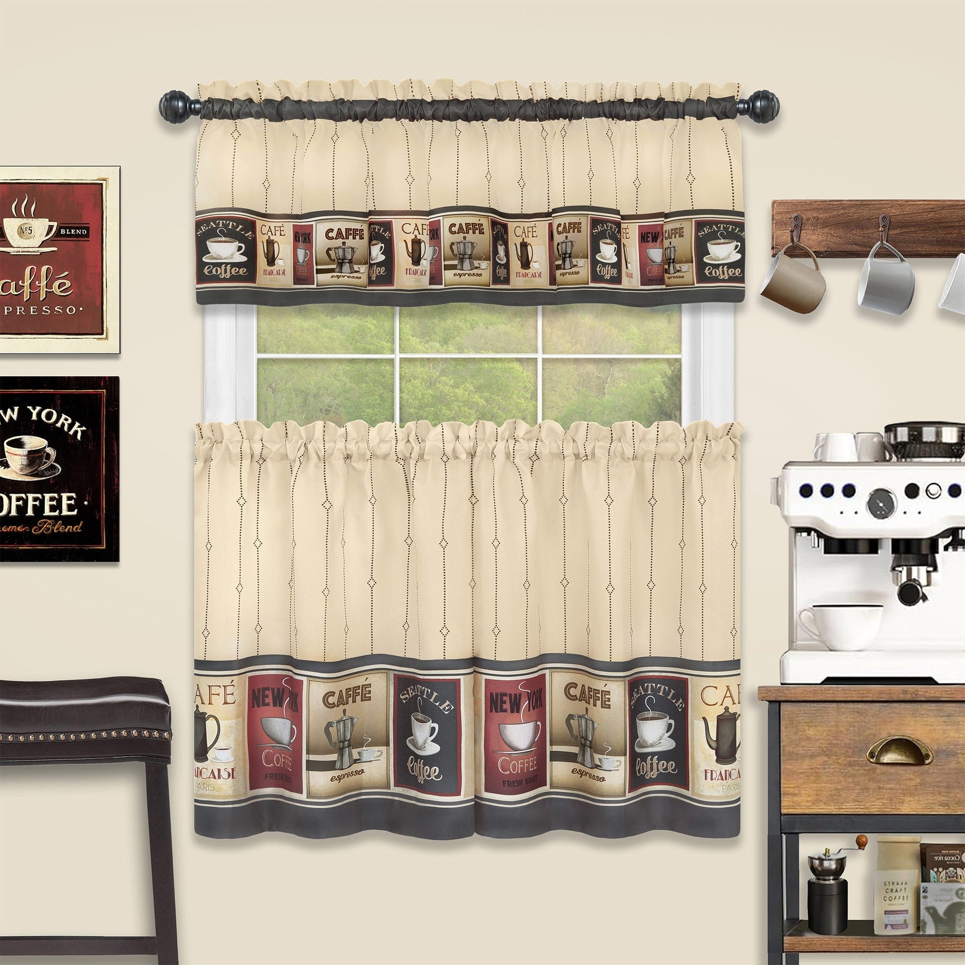 Achim Cozy Cafe Printed Kitchen Curtain Set, Tan-Black, Valance 58x13, Tiers 58x36 Inches