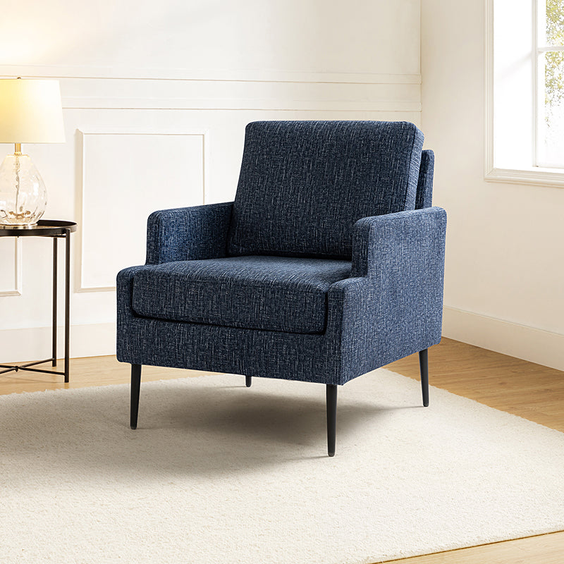 This accent chair boasts a mid-century modern design with thin, notched armrests that offer sturdy support and balance. The plush chenille fabric upholstery is both soft to the touch and durable. Featuring a sleek silhouette, the accent chair's tapered? metal legs provide support and a simple, modern look. With its slightly larger seat dimensions, this chair offers more freedom and flexibility of movement, allowing you to find the perfect position that suits your comfort preferences. Equipped with a comfy seat and backrest, it's perfect for long periods of sitting. Easy to assemble, the exquisite contemporary accent chair is a perfect addition to the living room, bedroom, or office, offering a unique design to round out various home decor.