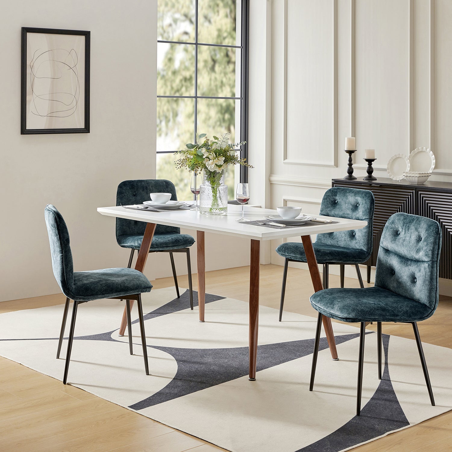 The mid-century modern dining chair set of 4 seamlessly blends style and comfort, featuring sumptuous upholstery in a luxurious blend of velvet and faux linen. Embracing the essence of sophistication, the chair set of 4 boasts meticulous piping and button tufting, creating a timeless appeal. The exquisite channel tufting on the backrest adds a touch of refinement, elevating the 7 overall design. Crafted for comfort, it invites you to linger over meals with its soft cushion and ergonomic structure. Supported by sleek metal legs, the chair set of 4 effortlessly marries form and function. Its fusion of retro charm and contemporary elegance makes it a statement piece, perfect for enhancing any dining space with its understated yet captivating design.