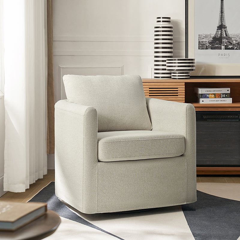 Designed for the living room and bedroom, this modern swivel chair seamlessly blends functionality with aesthetics. With its innovative 360-degree swivel base, you can effortlessly navigate your surroundings. The slipcover, crafted from touchable fabric mimicking the texture of linen, is chic and removable for easy washing. Embrace the dual-sided usability of the removable backrest and seat cushions, offering a quick flip for a fresh look and easy maintenance. The fabric with a linen-like texture provides a comfortable resting place for your arms. Elevate your space with this chic and versatile swivel chair, where contemporary design meets practicality.