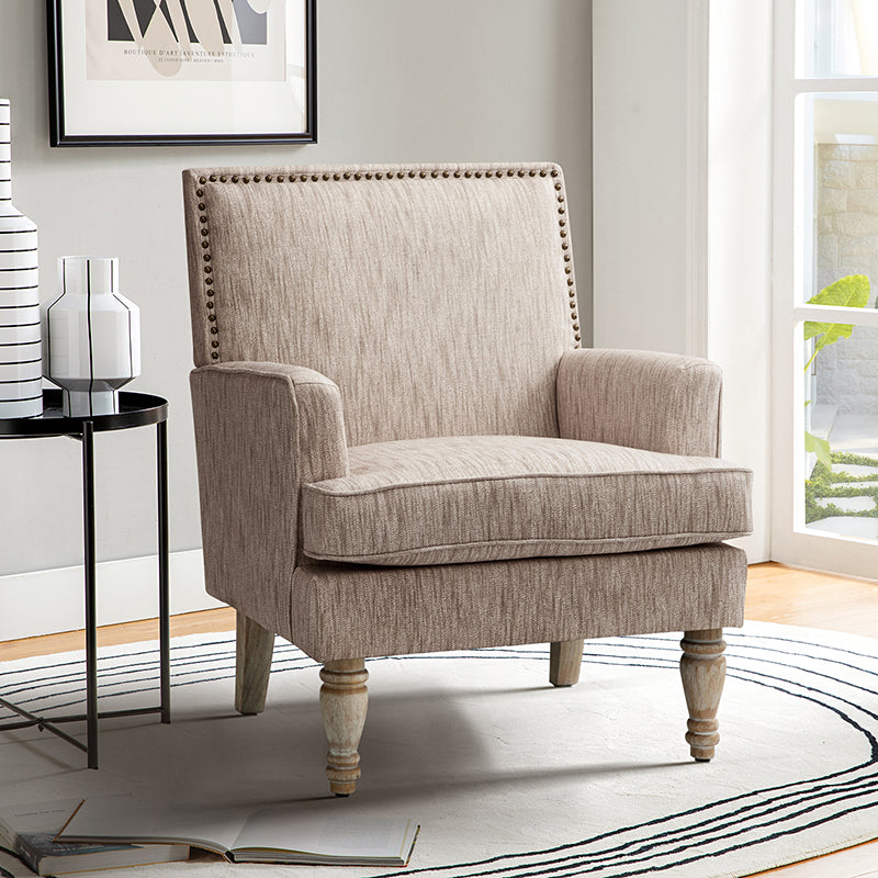 Looking to add an arm chair to your living room or bedroom? This one is in keeping with your glam sensibilities, adding an eye-catching touch to your space. This is the classic and contemporary style accent arm chair with glam nailhead trim on the backrest, which makes it attractive in vision. Providing you a rich choice in terms of fabric and pattern, this piece is wrapped with pure polyester or polyester blend fabric for a hint of textural appeal and features both solid and vivid floral patterns in different specific chairs. Medium-density foam filling with a solid and manufactured wood frame provides comfort and support. The elaborately carved wooden legs bring classic design and add to the timeless fashion of this piece. Including a comfortable seat with a removable cushion, this chair provides an essential spot for sitting and enjoying a good book or catching up on your favorite show, effectively reliving the pressure. It's the perfect pick for the living room, office room and bedroom.