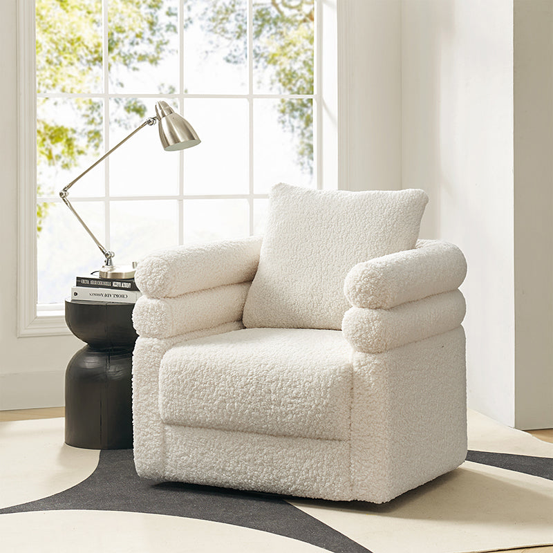 The modern barrel chair effortlessly combines a chic design with a handsome silhouette, offering a luxurious seating experience. It features a 360-degree swivel allowing for versatile movement and interaction. This sophisticated chair comes complete with a plush pillow, enhancing comfort and style. Wrapped in soft chenille fabric, the chair not only exudes elegance but also provides a cozy retreat. The attention to detail in both form and function makes this barrel chair a standout piece, making it suitable for various settings, from the vibrant ambiance of the living room to the serene comfort of the bedroom. Elevate your space with this tastefully crafted chair that seamlessly merges modernity and sophistication.