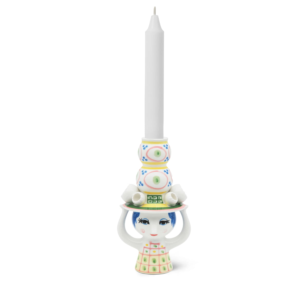 Candle holders are a reinterpretation of Wiinblad’s illustrations, and can hold both a candle stick or a tea light. Eva features a wide head and cone-shaped candle holder in glossy glazed ceramic with colored decal.