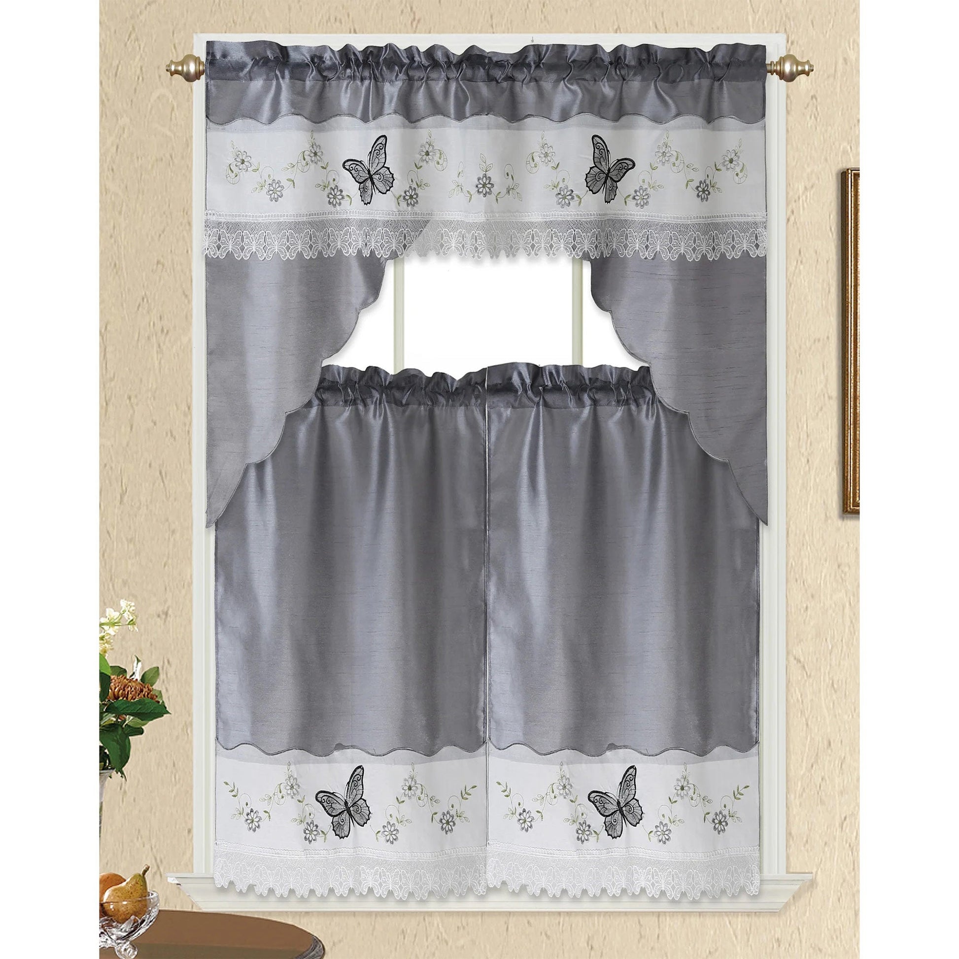 Butterfly 3 Piece Embroidered Kitchen Curtain Set, Silver, Swag 58x36, Tiers 30x36 Inches