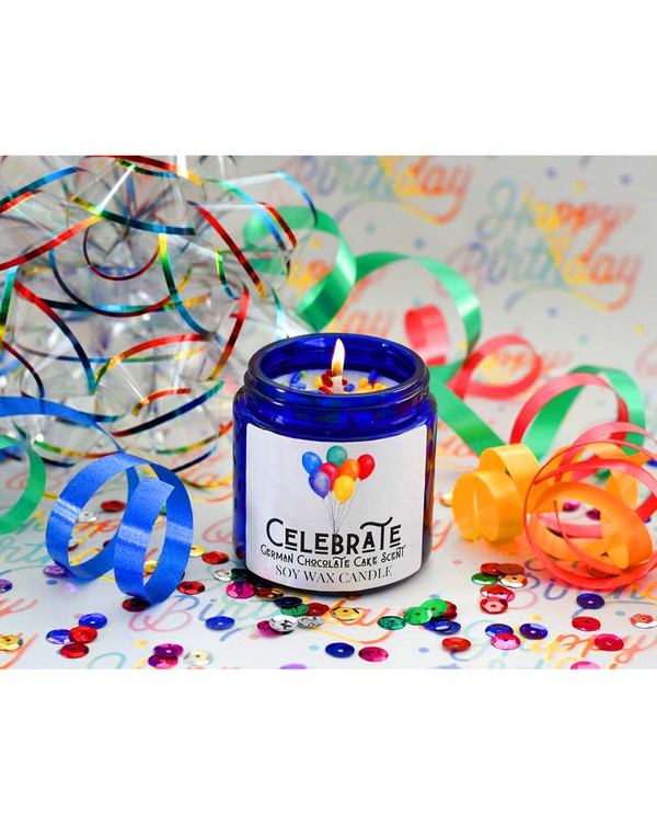 Celebrate soy wax candles are 4 oz each and have a 25 hour burn time. They are pure soy wax, poured into a beautiful cobalt blue glass jar and topped with celebratory sprinkles.