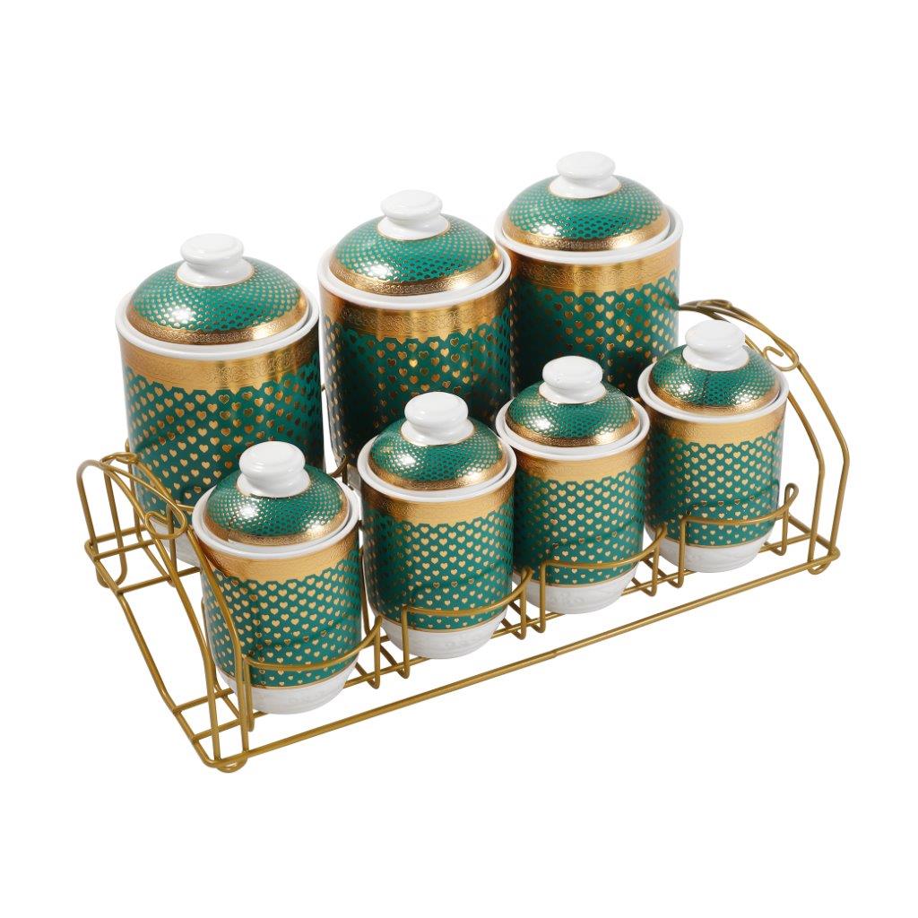 Ceramic Tea Coffee Sugar Spices Canister with Stand Set of 7 Pcs Green Gold 9.8*15.8/7.5*12.5 cm