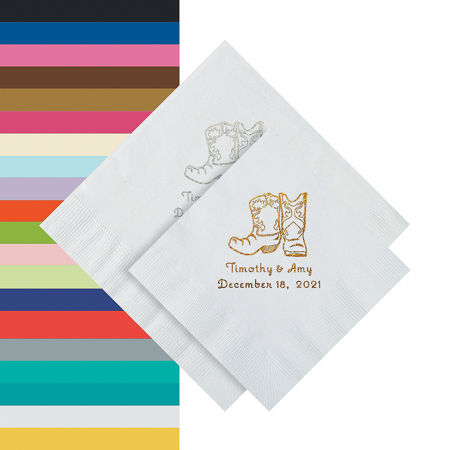 Affordable wedding reception ideas like personalized wedding napkins will have you kicking up your heels! Add western detail to your reception with these custom napkins. Add them to your drink table or at each drink station and display them at your buffet table or at each guest's place setting. It's the perfect way to commemorate your wedding day or Western party. Personalize with 2 lines of text. Printed with silver or gold foil. Paper. (50 pcs. per unit) Beverage, 5"; luncheon, 6 1/2". Not microwave safe.