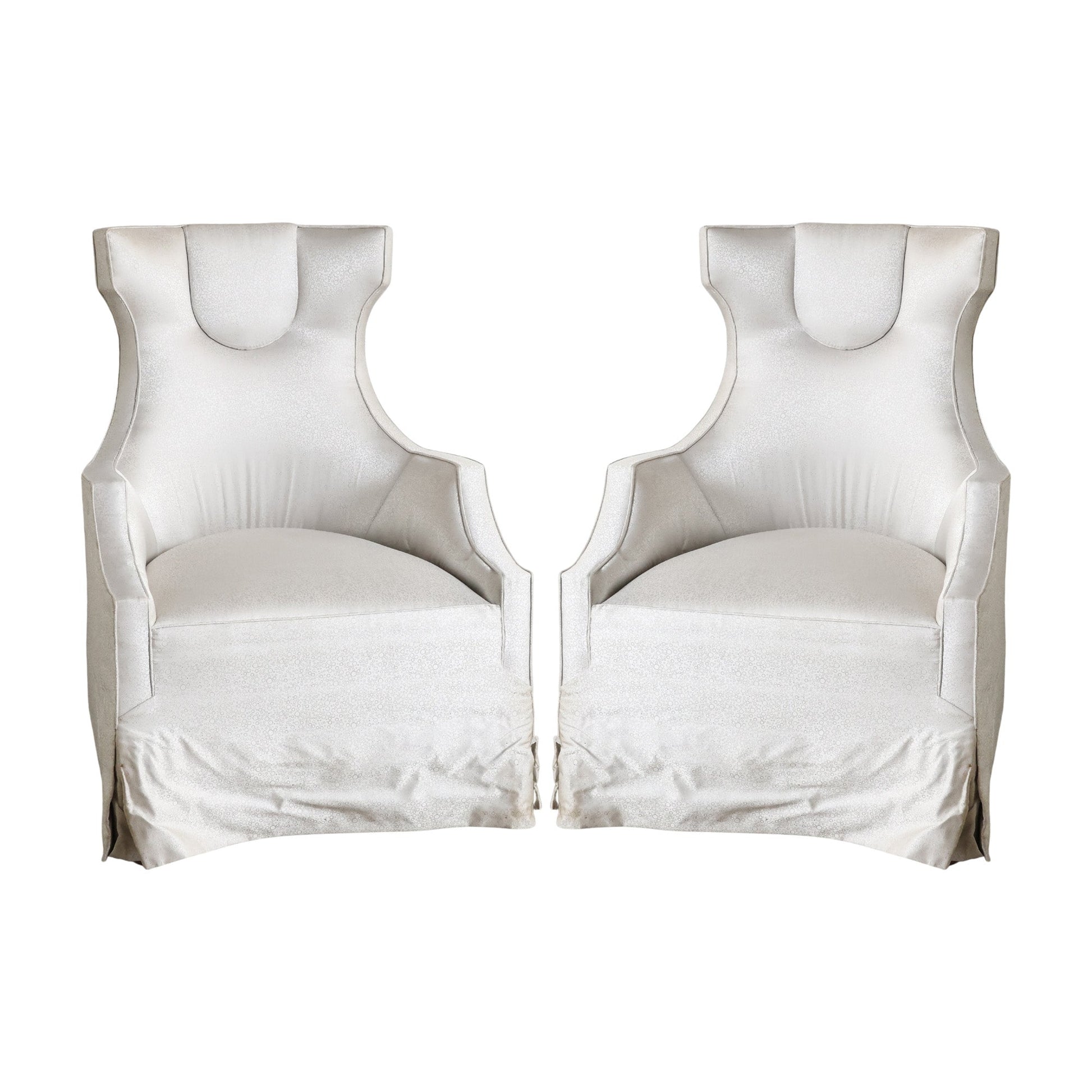 This structured vintage pair of occasional chairs features a geometric wingback design and flirty skirts.