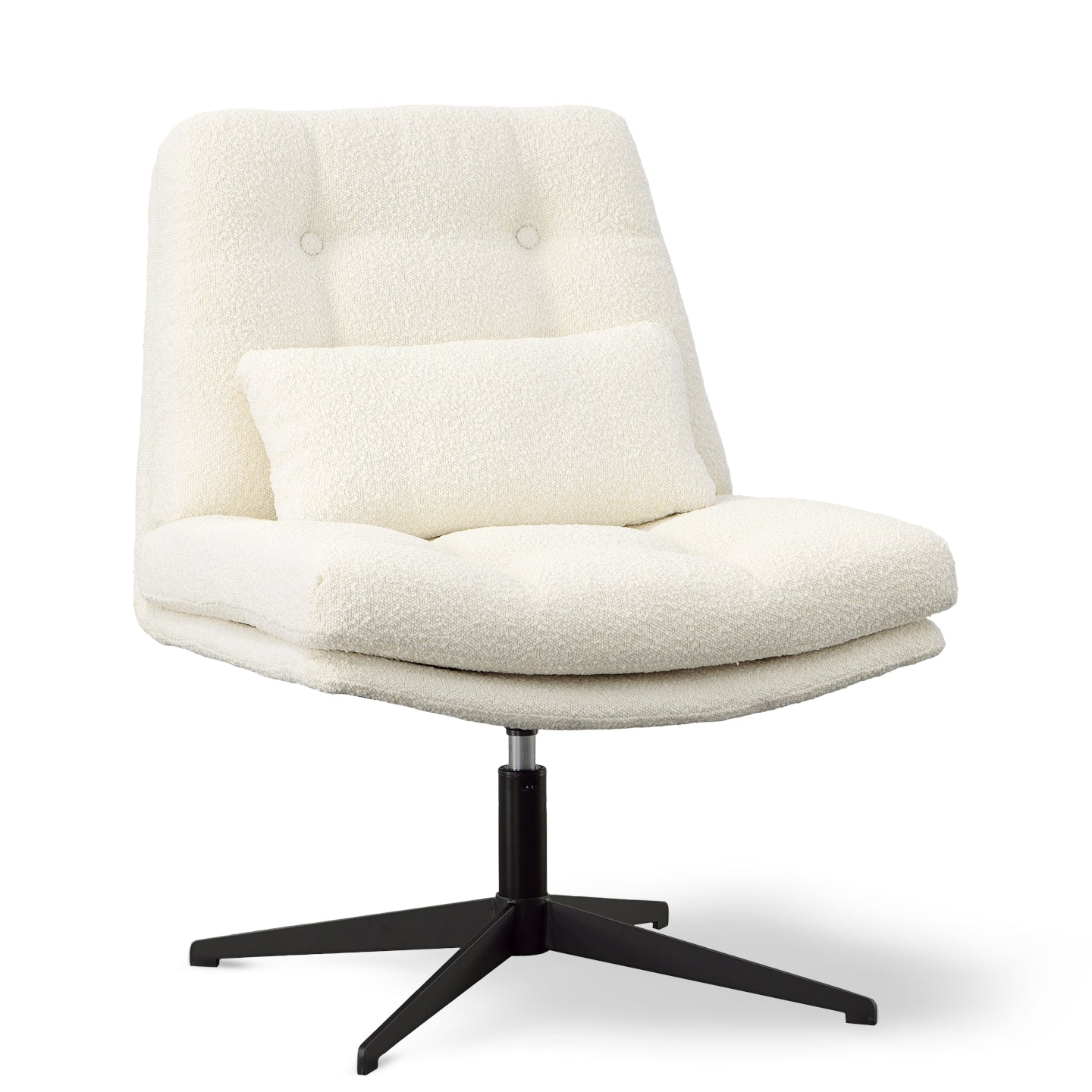 Seventies form tailored for modern design. Featuring textured boucle fabric seating with button tufting for retro effect, and swivel base for functional sensibility.