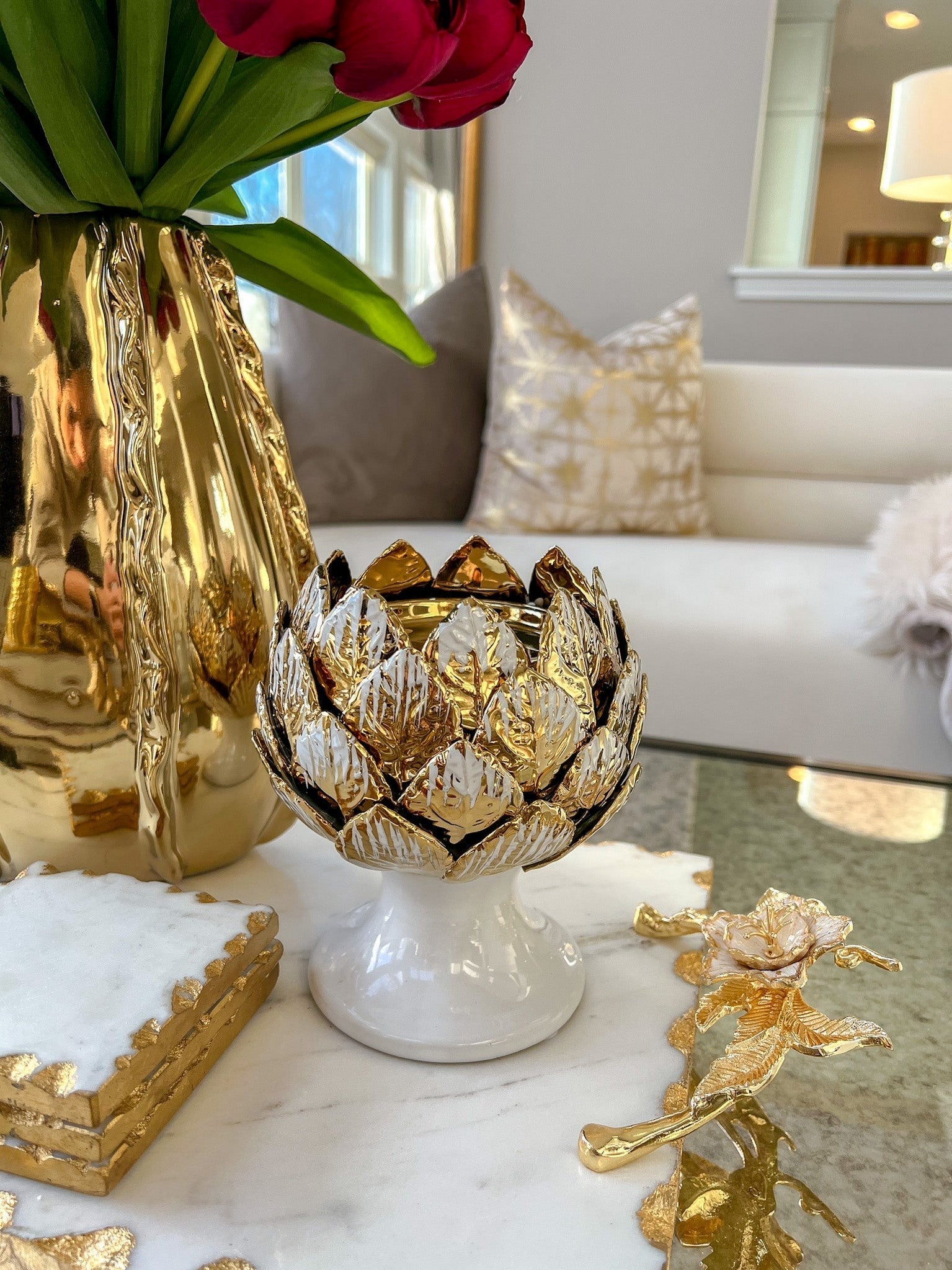 Description: The gold and white leaf shaped candleholder looks gorgeous on its own as decor or you can place a tea light to add to the aesthetic.