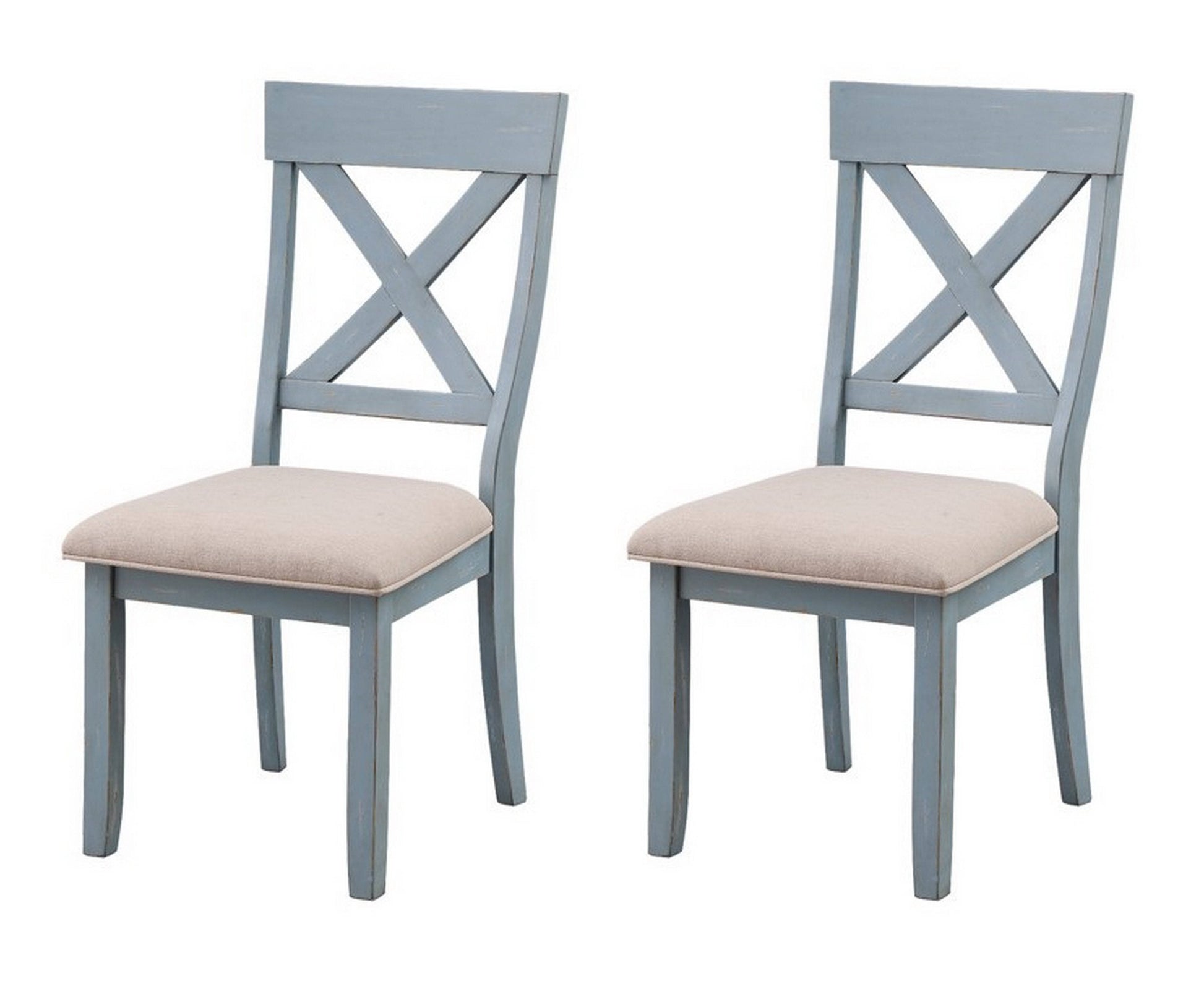 Enhance your dining experience with the elegant "X" back design and refreshing Blue finish of this Dining Chair. Designed to complement the matching Dining Table and coordinating Bench, this chair exudes style and sophistication. Featuring a plush cushioned seat covered in a light natural fabric, it offers unparalleled comfort. The gentle curve of the back provides additional support, creating a perfect space to enjoy dinner and engage in lively conversations or entertaining board game sessions.