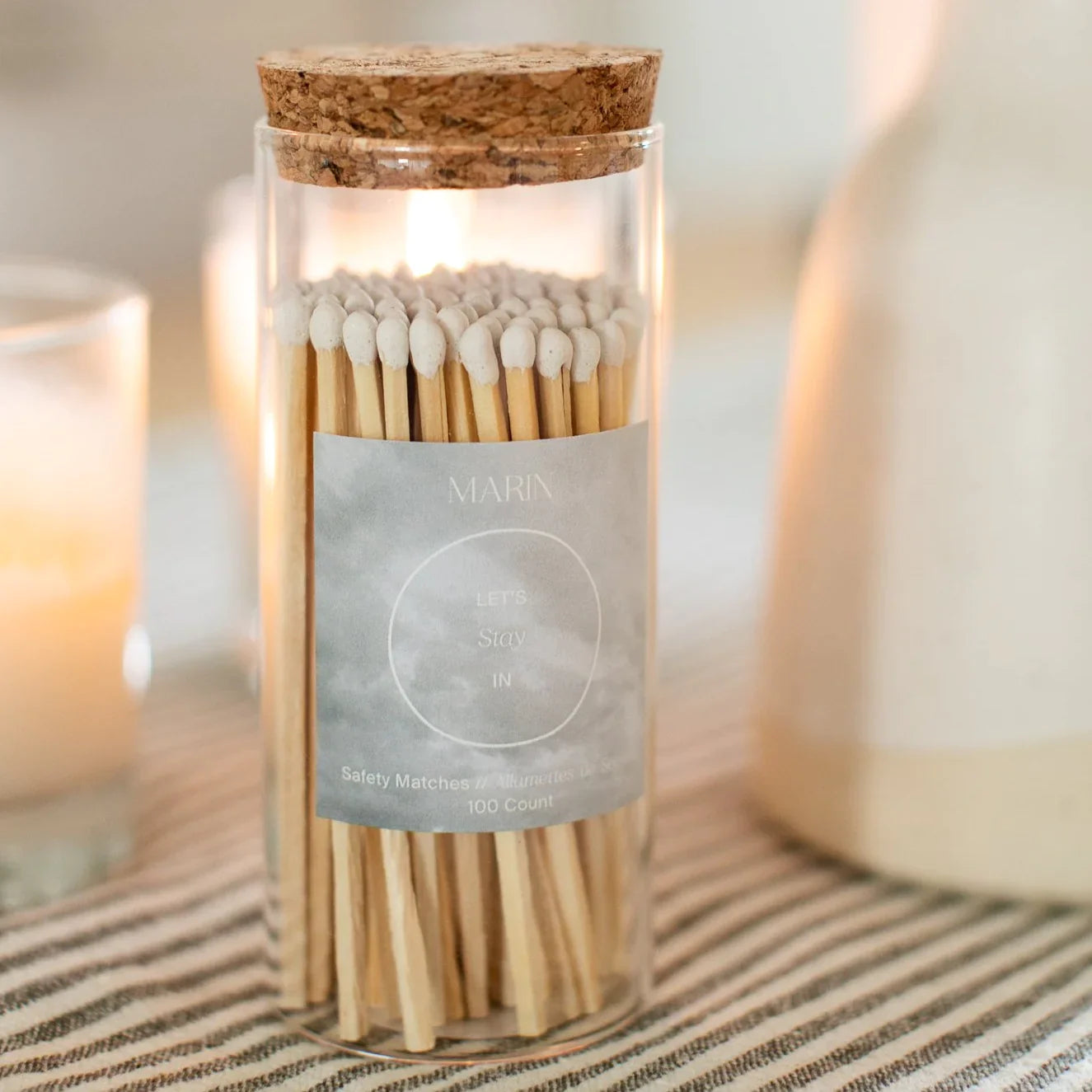 Our match bottles are a sophisticated and elegant way to store and display matches as decor. Showcasing our ‘Let’s Stay In' brandmark and exclusive strike-on-bottle design, each bottle features a striker strip on the back for lighting all your matches in style.