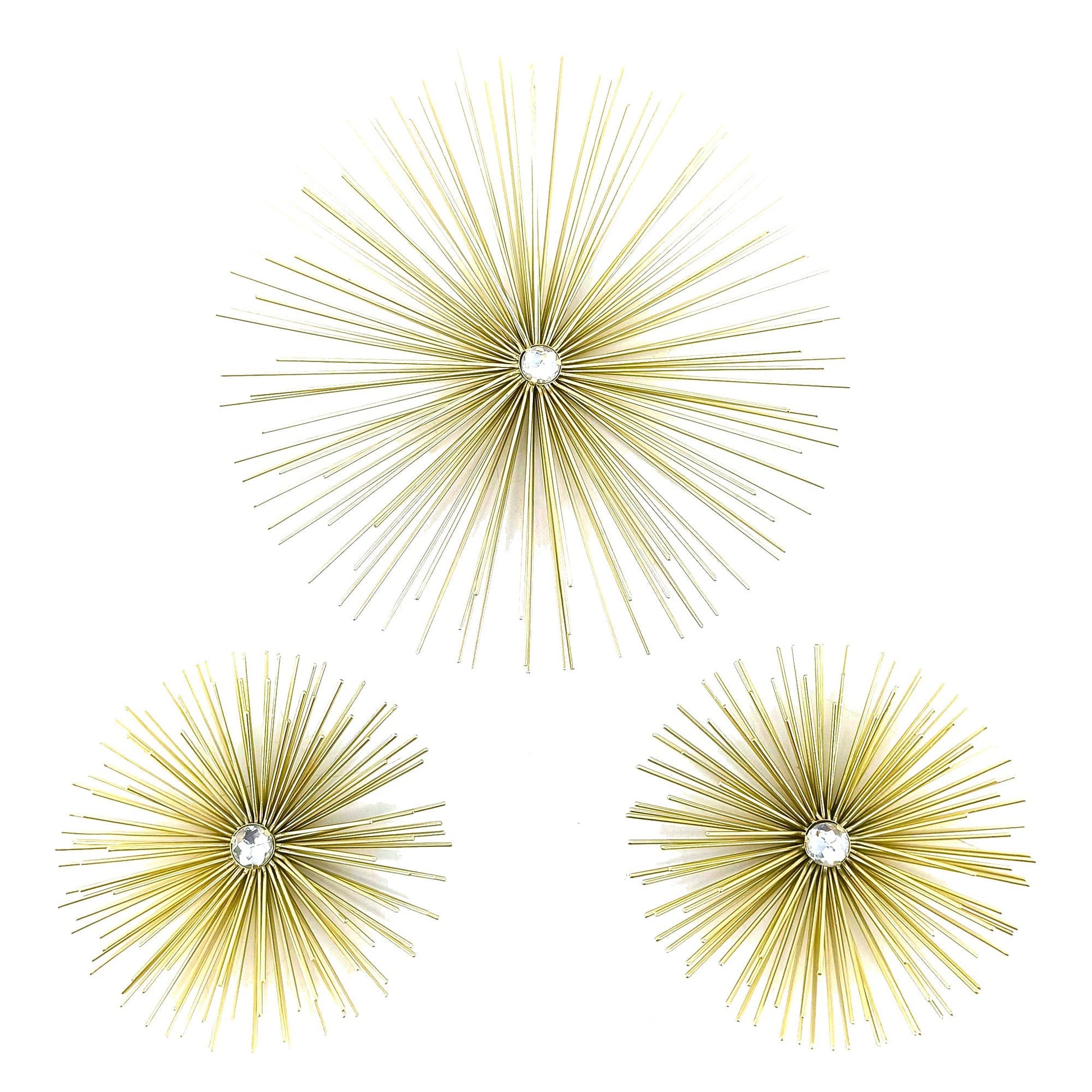 - Set includes 3 gold-colored starburst metal wall decor pieces