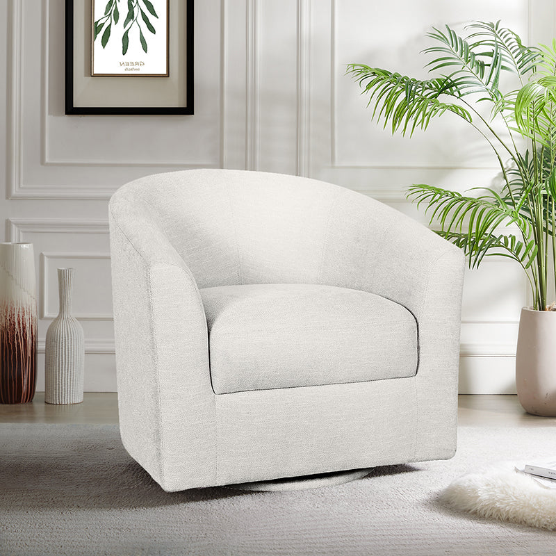 This barrel chair brings an inviting swivel feature to any corner. It has a manufactured wood frame and a metal swivel base. It's wrapped in polyester, and the foam-filled seat cushion and back provide just the right amount of support so you can forget about being tired after a long day at work. This chair boasts a classic barrel shape for a minimalist and stylish look. This barrel chair is the perfect choice to decorate your living space.