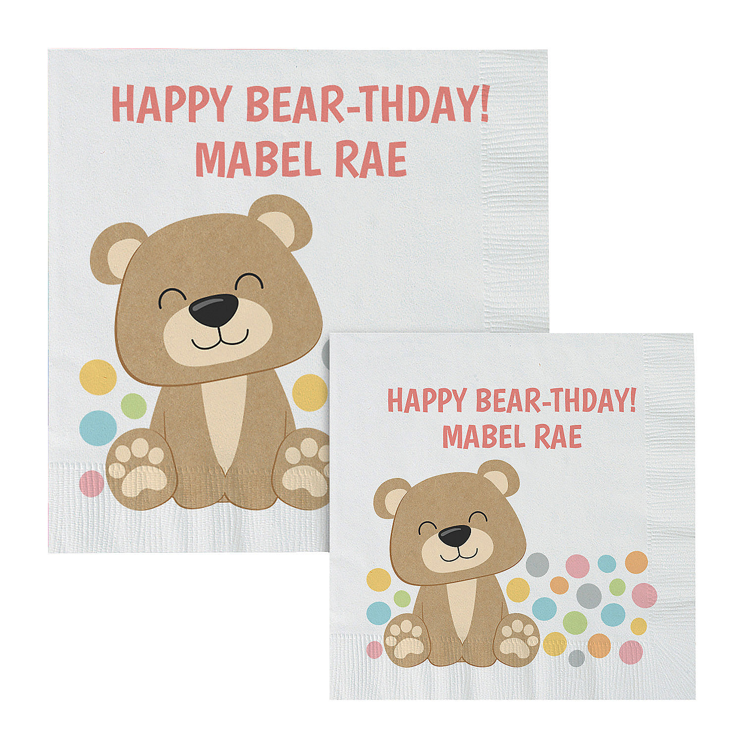 Wish your little one a veryhappy bear-thday with these custom napkins! Great for celebrating momentous first birthday parties, these teddy bear napkins are as sweet to view as they are useful in wiping up birthday cake crumbs and other spills. Personalize with 2 lines of text. Paper.(50 pcs. per unit) 6 1/2.