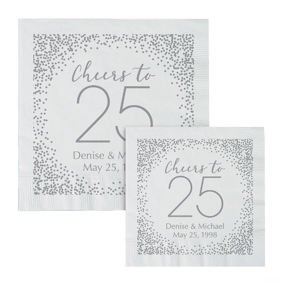 Celebrate a silver anniversary in style with these attractive napkins. These disposable napkins feature a 25th anniversary message along with personalized text the perfect napkins for a 25th wedding anniversary celebration. A big celebration calls for special party supplies and these personalized napkins fit the bill! Paper. (50 pcs. per unit) Personalize with 2 lines of text.