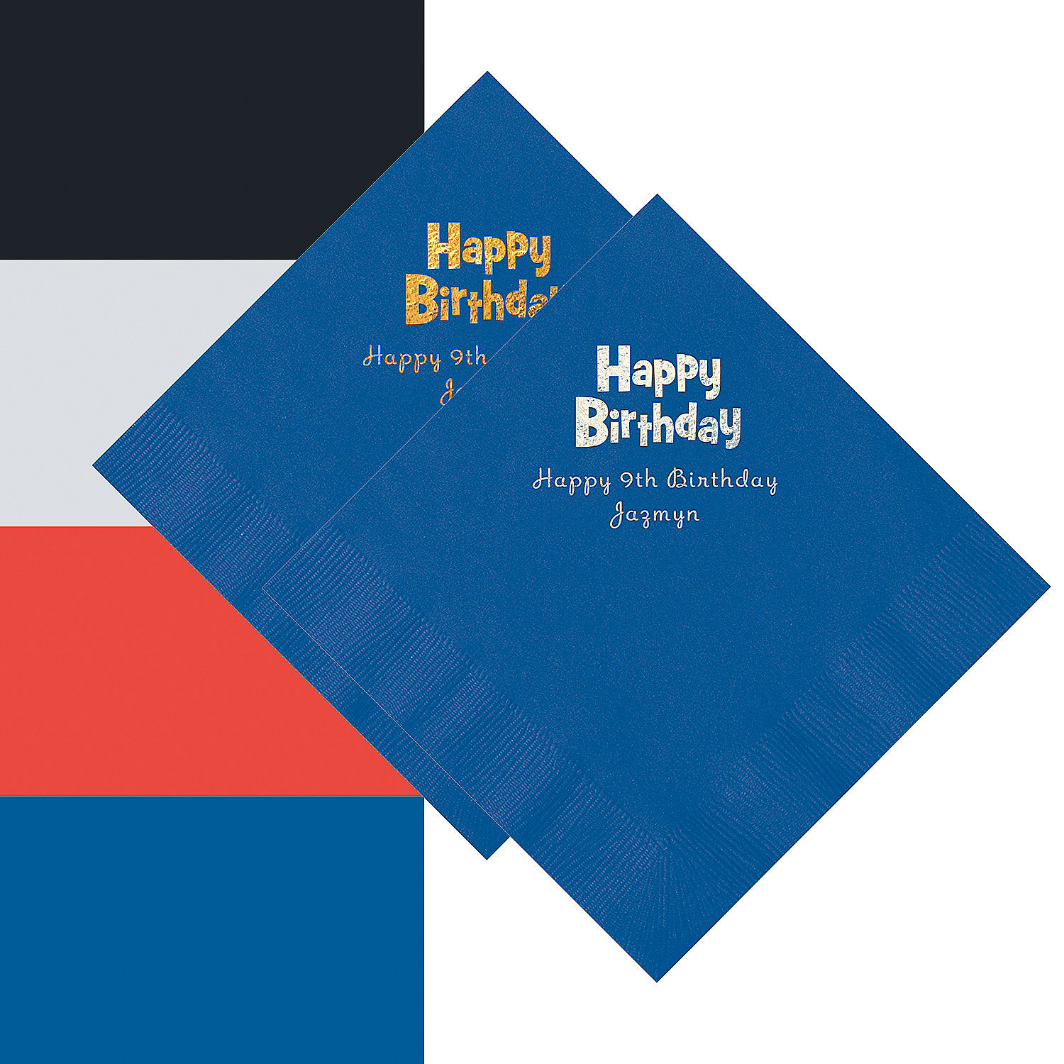 Make any birthday party celebration even happier with Personalized Birthday Beverage or Luncheon Napkins. Custom napkins are fun party supplies for every age. Choose colors to coordinate with any fun party theme. Personalize with 2 lines of 24 characters/spaces per line. Printed in silver or gold ink. Paper. (50 pcs. per unit) Beverage, 5"; luncheon, 6 1/2"