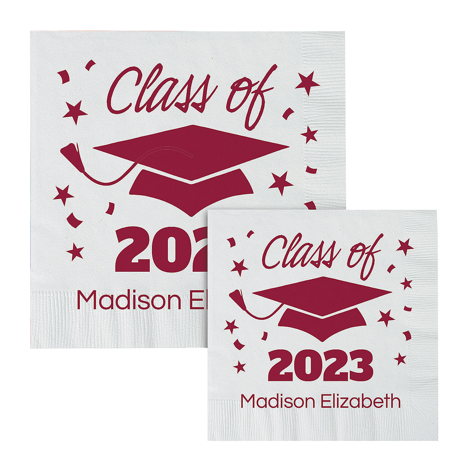 Celebrate a special graduate with these personalized napkins! These disposable napkins feature a celebratory graduation cap design and personalized text, making them the perfect napkins for a graduation party. Extend the celebration to the food table or beverage bar with these fun napkins that are made unique with personalized text. Paper. (50 pcs. per unit) Personalize with 2 lines of text.