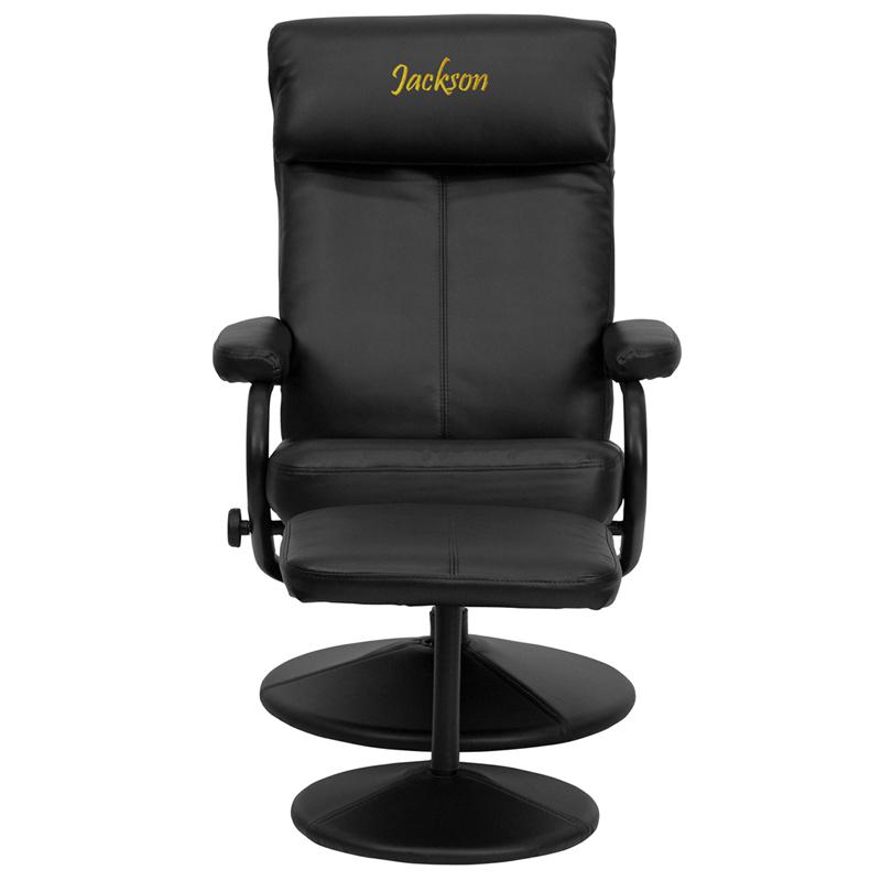 Personalized Contemporary Multi-Position Headrest Recliner and Ottoman with Wrapped Base in Black LeatherSoft