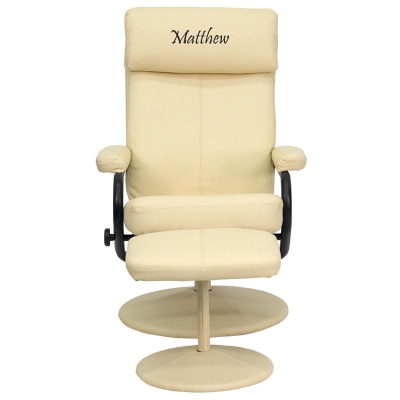 Personalized Contemporary Multi-Position Headrest Recliner and Ottoman with Wrapped Base in Cream LeatherSoft