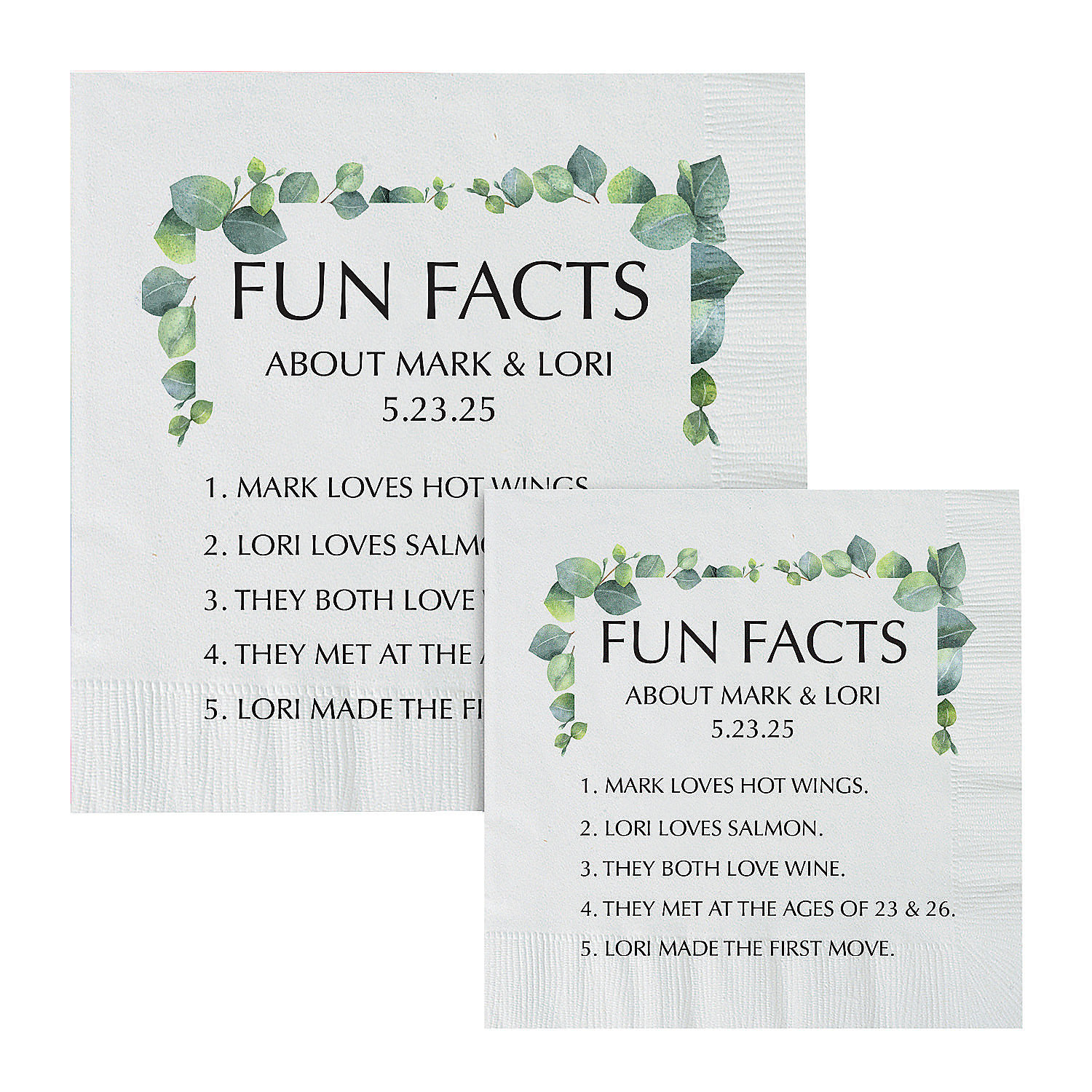 These are ‚ merely wedding reception napkins ‚ they‚ also conversation starters! Reveal some fun facts about the happy couple on these personalized napkins that will help guests feel even closer to the newlyweds. The pretty greenery design adds some elegance to these fun napkins, making these napkins wedding reception supplies must-haves! Paper. (50 pcs. per unit) Personalize with 7 lines of text.