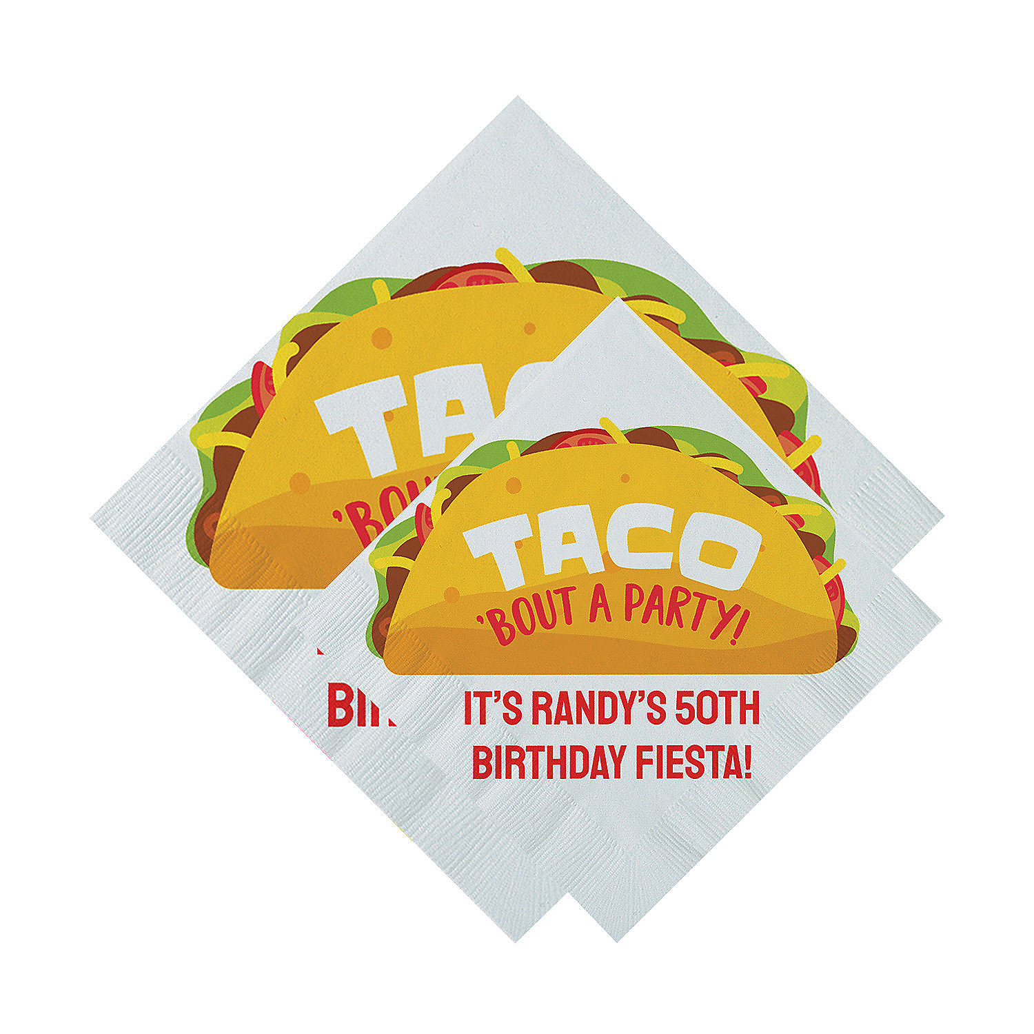 Taco bout a party! Whether its a birthday, anniversary, retirement, baby or bridal shower party, these napkins are fundamental for your fiesta. Load up the table with tacos and some of your favorite sides like homemade salsa and chips, cilantro lime rice, stuffed mini sweet peppers and a handful of these cute napkins for your guests! Customize with your event info or any other special message. Personalize with 2 lines of text. Paper. (50 pcs. per unit) 5"
