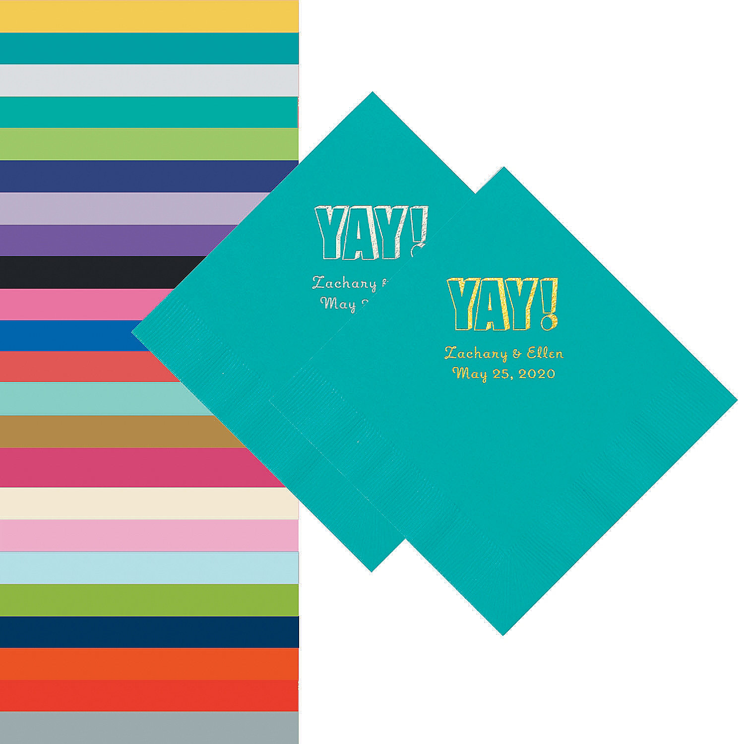Commemorate your big day by adding Personalized Yay! Beverage or Luncheon Napkins to your wedding supplies. Custom napkins are a fun and affordable way to add a personal touch to your wedding reception, engagement party and bridal shower decorations. Personalize with the couples name and wedding date and use for all the special events leading up to the wedding ceremony. With so many colors to choose from, you can order custom napkins to complement the wedding colors for the wedding reception and order a smaller batch for the other wedding parties prior to the big day. Our low prices allow you to consider mixing and matching colors to stack throughout the wedding reception, couples shower, bachelorette party, etc. Yay! Personalize with 2 lines of text. Printed with gold or silver foil. Paper. (50 pcs. per unit) Beverage, 5"; luncheon, 6 1/2". Not microwave safe.