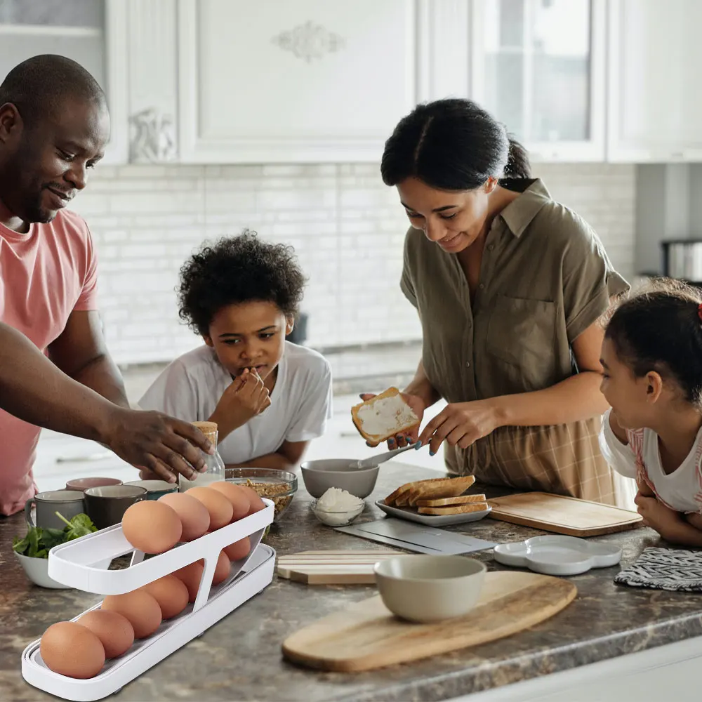1��[ Automatic Rolling Down ]?Egg Dispenser features a convenient gravity-fed design. Eggs are dispensed at a time from an inclined track. Take out the eggs from the outlet, and the eggs inside will roll out automatically.