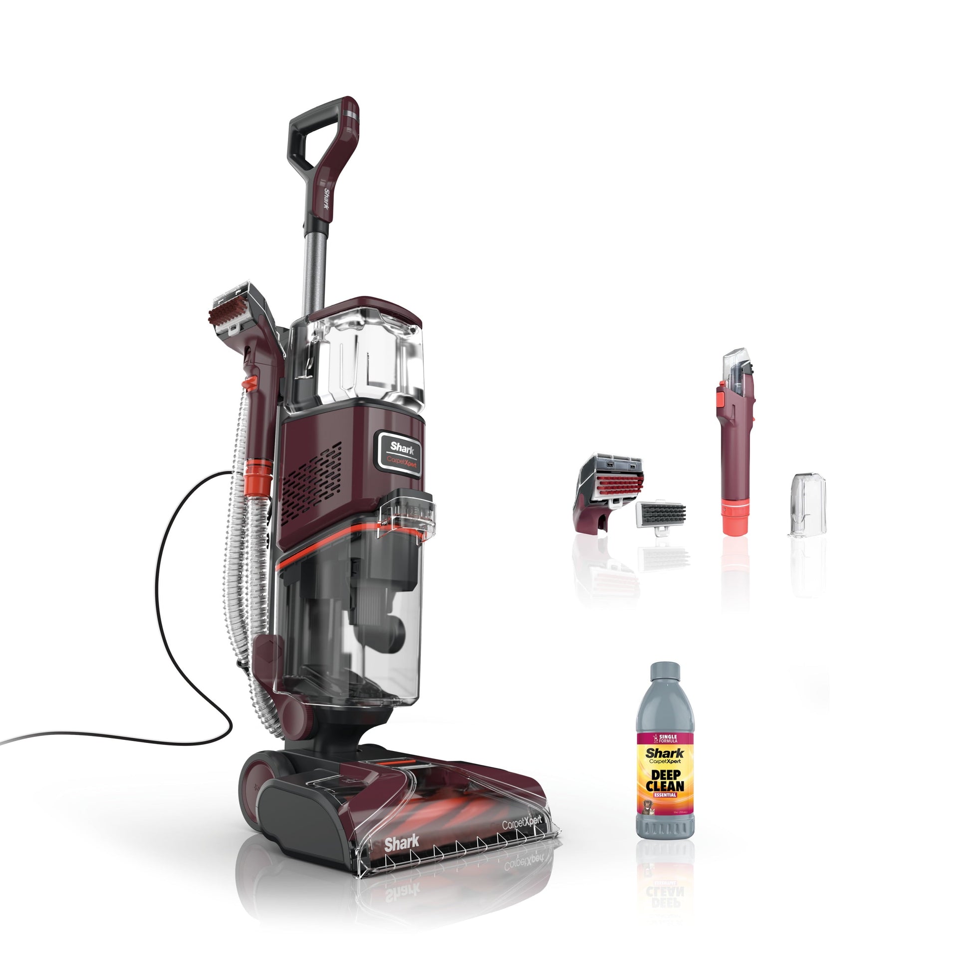 - WHAT'S INCLUDED: 3.5 inch reversible bristle tool, Integrated crevice tool, Hose-cleaning tool, and 12oz Shark CarpetXpert Deep Clean Essential formula