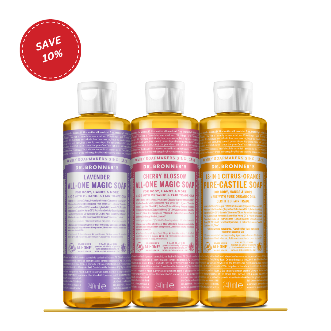 The 18-in-1 Pure-Castile Liquid Soaps are good for just about any cleaning task. Face, body, hair & food, dishes, laundry, mopping, pets—clean your house and body with no synthetic preservatives, detergents or foaming agents—none! Dilute! Dilute! OK!