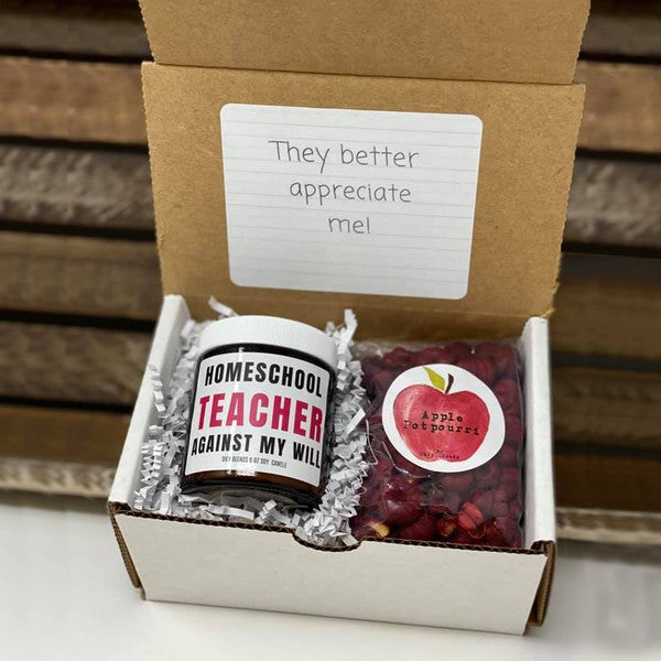 Each box includes a 6 oz soy wax candle and a bag of mini apple potpourri. Made in Orlando, FL.